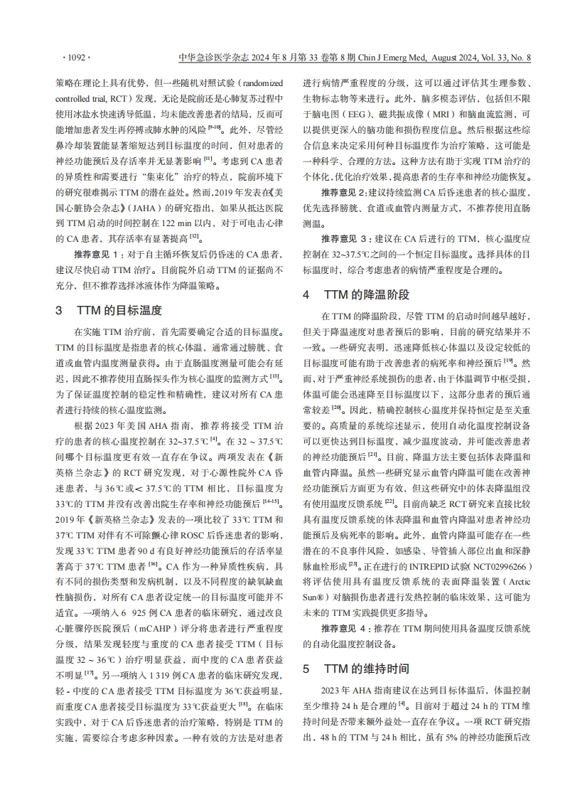 中华急诊医学杂志2024年8月第33卷第8期Chin J Emerg Med,August2024,ol.33,No.8·1091··专家共识·心脏骤停后高质量目标温度管理专家共识(2024)北京医学会急诊分会京津冀急诊急救联盟中国医学救援协会心肺复苏分会海峡两岸医药卫生交流协会急诊医学分会中国急诊目标温度管理项目协作组通信作者:李春盛,首都医科大学附属北京友谊医院,Email:lcscyyy(@163.com谢苗荣,首都医科大学附属北京友谊医院,Email::yyyyxmr(@ccmu.edu.am;张国强,中日友好医院,Email::zhangchong2003@ip.a.com;唐子人,首都医科大学附属北京朝阳医院,Eail:tangziren1970@126.com基金项目:国家自然科学基金(82072136);首都卫生发展科研专项(首发2022-1-2032);高层次公共卫生技术人才建设项目(学科带头人-01-01):北京市医管局“登峰”人才计划项目(DFL20240302);高水平医院临床业务费专项临床研究项目(222-NHLHCRF-YS-0B)D0I:10.3760/cma.j.issm.1671-0282.2024.08.004心脏骤停(cardiac amrest,CA)是全球成人主要死亡原因之医学会急诊分会、京津冀急诊急救联盟、中国医学救援协一,院外心脏骤停(out-of-hospital cardiac amrest,OHCA)的年会心肺复苏分会、海峡两岸医药卫生交流协会急诊医学发病率在10万人中为30.0-97.1例四。我国OHCA患者每年分会成立了共识编写组,共同制定了《心脏骤停后高质超过百万,但出院存活率和良好神经功能预后的比例极低冈。量目标温度管理专家共识(2024)》(指南共识注册编号:CA后脑损伤是导致患者死亡和长期残疾的关键因素)。目标PREPARE-2023CN578共识的制订方法采用共识会议法.温度管理(targeted temperature management,TTM)是当前国过程包括题目的选定和申请,成立编写小组,提出关键问题,际指南中唯一被推荐的具有神经保护效果的干预措施鬥。尽系统检索相关文献,撰写专家共识初稿。初稿由共识编写管目标温度的选择在TTM治疗过程中一直存在争议,但最组专家函审,修订稿由专家讨论会确定终稿,再次提交共新的证据表明,高质量的TTM治疗对于改善CA患者的预识编写组专家审核定稿,最终专家组成员得出一致性程度后至关重要问。较高的推荐意见。高质量的TTM不仅关注降温和维持阶段,还包括目标温度的选择、复温和维持正常体温等阶段。CA作为一种异1高质量TTM的定义质性疾病,具有不同的损伤类型及发病机制。鉴于CA患TTM是一种“集束化”的治疗干预手段,其包括低温者的损伤程度存在个体差异,个体化的TTM治疗显得尤为诱导、温度维持及复温等三个阶段。高质量TTM是强调在关键。因此,在实施高质量的TTM过程中,需要对患者进整个治疗过程中进行持续的动态评估、诊断和干预,以确行病情严重程度评估。基于这一评估,为患者设定合适的目保治疗的连贯性和有效性。同时,及时识别并处理可能出标温度,并制定相应的治疗方案。同时,对可能出现的并发现的并发症,从而优化TTM的各个环节,更好的改善患者症进行积极的预防和处理,以确保治疗过程的安全性和有效预后。性。2016年发布《心脏骤停后目标温度管理专家共识》后,2TTM的启动时机至今关于TTM的高质量临床研究又陆续发表四。基于以上考虑,本文旨在总结最新的临床研究证据,优化TTM治疗2023年美国心脏协会(AHA)发布的心肺复苏和心血1流程,制定专家共识,以期为临床实践提供指导,改善CA管急救指南推荐,在CA成人患者自主循环恢复后若仍处于患者的神经功能预后。2022年国际复苏联合会(LCOR)昏迷状态,应进行目标温度管理(TTM)治疗。然而,该用“温度控制”取代了“TTM”,本共识为了便于理解,将指南并未具体说明TTM的启动时机。研究表明,心肺复苏继续采用术语“TTM”。后迅速启动TTM有助于减轻再灌注损伤,且每延迟1h启本共识由中国急诊目标温度管理项目协作组、北京动TTM,患者的死亡风险可能增加约20%网。尽管早期降温