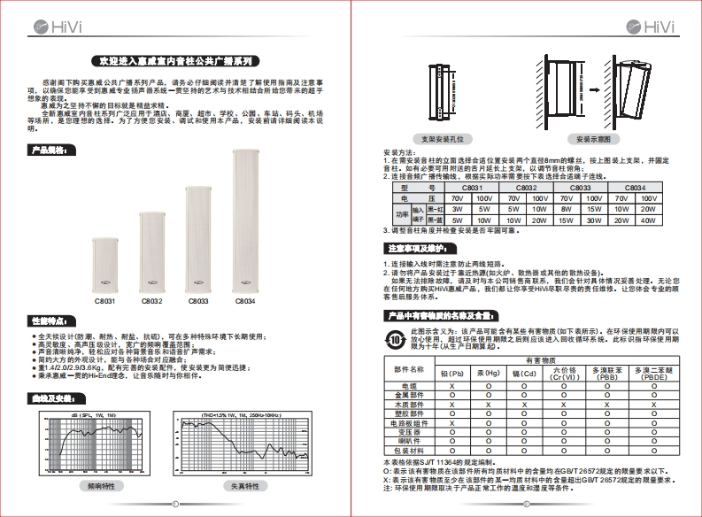 惠威室内音柱广播系统(C803 SERIES MANUAL)V速威美国ViAcoustc气ne11630 Gddring RoadArcada.CA 91006.USATRet+16269E00606Fa1c+16269300E09V惠威中国珠海南感料技有限公同广扫珠海市联速工业区大林山片区东成路南1号电话07任-868035传商:07566263006,6正8052客户程务线:400-0E09199产品说明书因设计变更等原因,所示资料可能与实物不符,惩不另行通知。www.hivi.comDue to the reasons inthe change of de sign or others.product information containe dhere may not bein con formity with product itselt.Wereserve the right of no prior nodice before change.