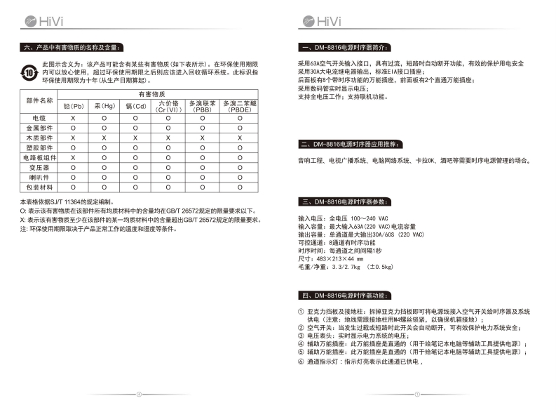 DM-8816电源时序器产品说明书HM惠威美国Hivi Acoustics,Inc.11630 Goldring Road,Areadia,CA 91006,USAT6:+16289300806Fx:+16288300603HM惠威中国殊海真威科枝有限公司广东碳唐市联港工业区大林山片区东成痛南1号电话:0756-6255035传真:0756-62E8005.6265062客户暖务热线:400-090-91www.hivi.com崇因?计安要等原因,斯示资料可能与实物不行。忽不行酒包。Due to the reasons in the change of design or others,product infommation contained here may not bein confomity wih product itset.We reserve the right of no prior notice befare change.