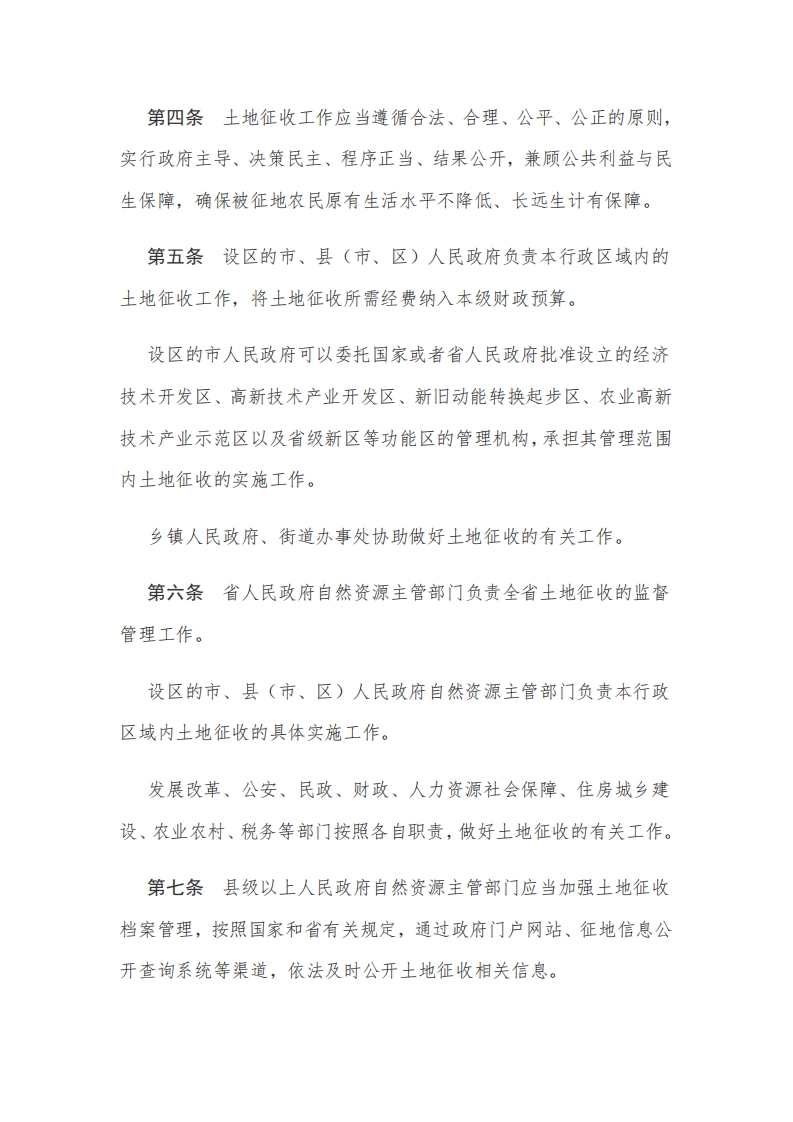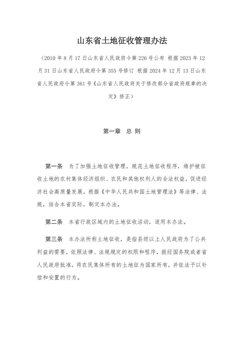 山东省土地征收管理办法(2010年8月17日山东省人民政府令第226号公布根据2023年12月31日山东省人民政府令第355号修订根据2024年12月13日山东省人民政府令第361号《山东省人民政府关于修改部分省政府规章的决定》修正)第一章总则第一条为了加强土地征收管理,规范土地征收程序,维护被征收土地的农村集体经济组织、农民和其他权利人的合法权益,促进经济社会高质量发展,根据《中华人民共和国土地管理法》等法律、法规,结合本省实际,制定本办法。第二条本省行政区域内的土地征收活动,适用本办法。第三条本办法所称土地征收,是指县级以上人民政府为了公共利益的需要,依照法律、法规规定的权限和程序,报经国务院或者省人民政府批准,将农民集体所有的土地征为国家所有,并依法予以补偿和安置的行为。