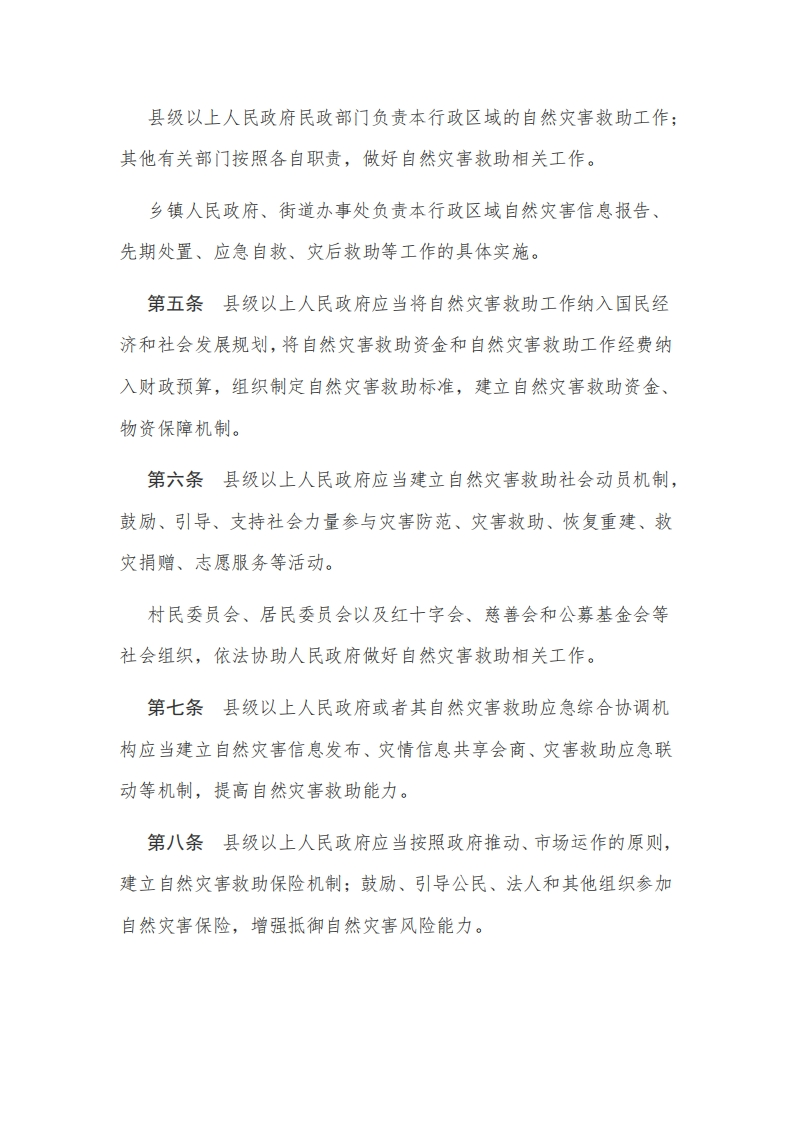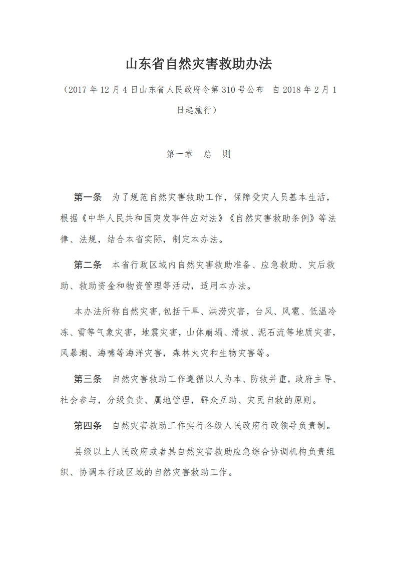 山东省自然灾害救助办法(2017年12月4日山东省人民政府令第310号公布自2018年2月1日起施行)第一章总则第一条为了规范自然灾害救助工作,保障受灾人员基本生活,根据《中华人民共和国突发事件应对法》《自然灾害救助条例》等法律、法规,结合本省实际,制定本办法。第二条本省行政区域内自然灾害救助准备、应急救助、灾后救助、救助资金和物资管理等活动,适用本办法。本办法所称自然灾害,包括干旱、洪涝灾害,台风、风雹、低温冷冻、雪等气象灾害,地震灾害,山体崩塌、滑坡、泥石流等地质灾害,风暴潮、海啸等海洋灾害,森林火灾和生物灾害等。第三条自然灾害救助工作遵循以人为本、防救并重,政府主导、社会参与,分级负责、属地管理,群众互助、灾民自救的原则。第四条自然灾害救助工作实行各级人民政府行政领导负责制。县级以上人民政府或者其自然灾害救助应急综合协调机构负责组织、协调本行政区域的自然灾害救助工作。