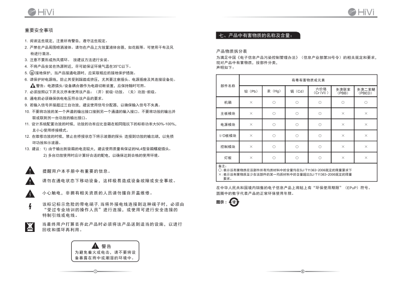 惠威音频功率放大器HiVi EX435/EX465)①110011①HV唐威美国Hivi Acousties,He11630 Goldring Road Aradia,CA 91005.USAT+16269300605Fa+16269g0C609HW唐威中国味海事藏料技有果公同广东省强海市联港工业区大林山片区东战座南1等卓话:0756-6286005传离:0756626800,628052客户相务鹅线:4000909199产品说明书www.hivi-pro.com高不林不fdThe、product im mstion con ned here may not bein oonformity with product tselt.We resenve the right af no prior notice before change.
