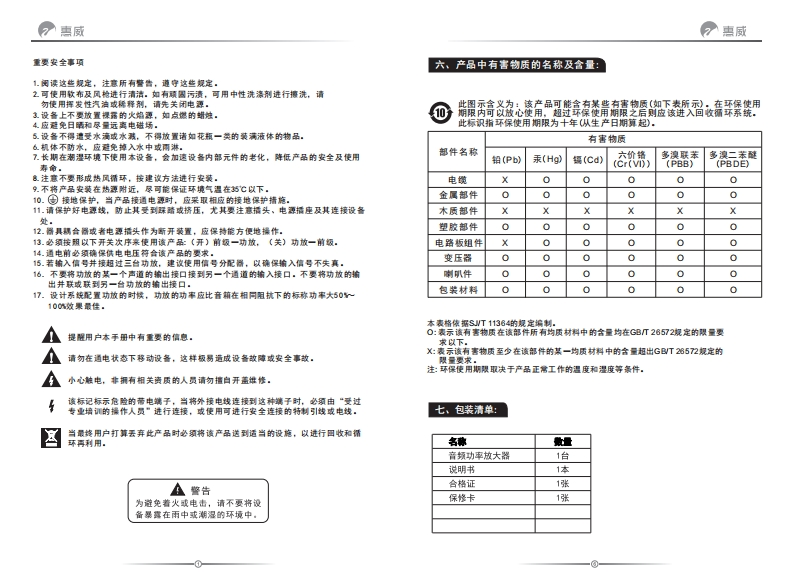 惠威音频功率放大器FA系列HM惠威黄国HiV Acoustics,Inc.11630 Goldring Road,Aecadia.CA 91006.USAT6+16269300e08Fx:+162893008092HM真威中国珠商西藏科技有限公司广东省底海市联港工业区大林山片区东成路南1号电话:0766-6265036传真:0756-6208005.626B052畜户图务热线:400-000-9199产品说明书www.hivi.com&o际高奇不流不2 maton contane4 er may not1in conformity with product itsel.We reserve the right of no prior notice before change.