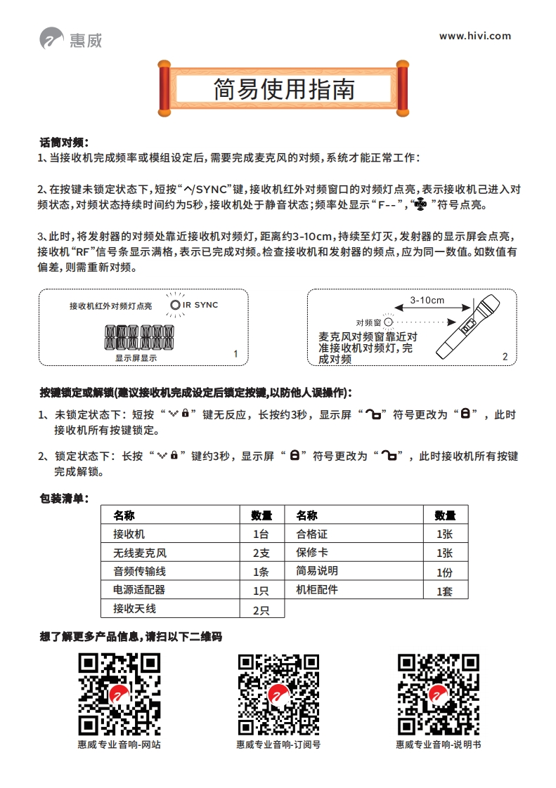 惠威www.hivi.com简易使用指南前面板700刀g8g806面①左通道音量加减按键⑤右通道操作按键②左通道操作按键⑥右通道音量加减按键③红外对频窗口⑦电源开关(或按键)④LCD液晶显示窗口背板同①天线接口(左右通道共用天线)④左右混合6.35mm非平衡音频输出接口②右通道XLR平衡音频输出接口⑤左通道XLR平衡音频输出接口③直流电源输入接口接收机LCD液晶显示屏000000④OTEPOITE⑧③囚国H明四国H帽源⑨+10RHz①①右通道频率或模组/功能调整时显示对应的英文字符②左通道频率或模组/功能调整时显示对应的英文字符③采用真分集电路时两个高频系统的切换指示:接收机工作时会根据前后天线的接收效果切换,“圆圆”会闪烁转换,指示正在采用的高频系统。④接收到的无线信号强弱的指示⑤接收到的音频信号大小的指示⑥对应的发射器(手持麦克风)电池电量指示⑦对频符号:闪烁表示接收机正在发射对频信号⑧静音指示(包括未接收到信号、发射器关机等)⑨按键锁⑩频道:本设备属频道调整优先,我们已经为每个频道设置了不同的频点,在多台设备同时使用时(如卡拉0K应用),根据接收机的放置远近,左右通道按顺序CH001-CH100,CH101-CH200调整即可。①射频频率单位