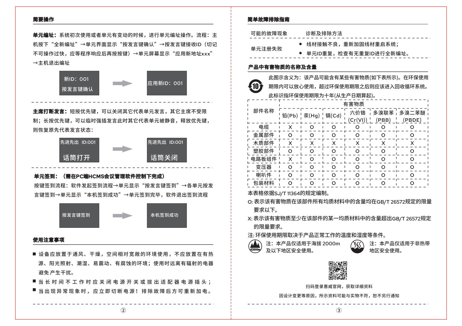 功能说明①②③e有线数字控制会议系统@HCS1500单元产品说明书④⑤⑧一、单元示意图(主席单元有红色优先键,代表单元没有)①咪杆(标配长度410mm)②橡胶垫脚③产品标贴区④主席单元红色优先键(PRIO)⑤发言键⑤LED双色指示灯⑦128*64黑底白字0LED显示屏⑧带锁紧螺母8P插头线缆(母头)二、附件①保修卡×1②说明书×1③合格证×1单元简要参数屏幕:128*64黑底白字背光0LED显示屏尺寸:110*130*60mm重量:0.6Kg灵敏度:-46dB±1dB额定电压:DC24V咪杆长度:410mm(标配咪杆)珠海惠威科技有限公司拾音距离:100-600mm(参考距离)广东珠海市联港工业区东成路南1号(备注:主席区别与代表带有优先键)官网:www.hivi.com客户服务热线:400-0909-199①