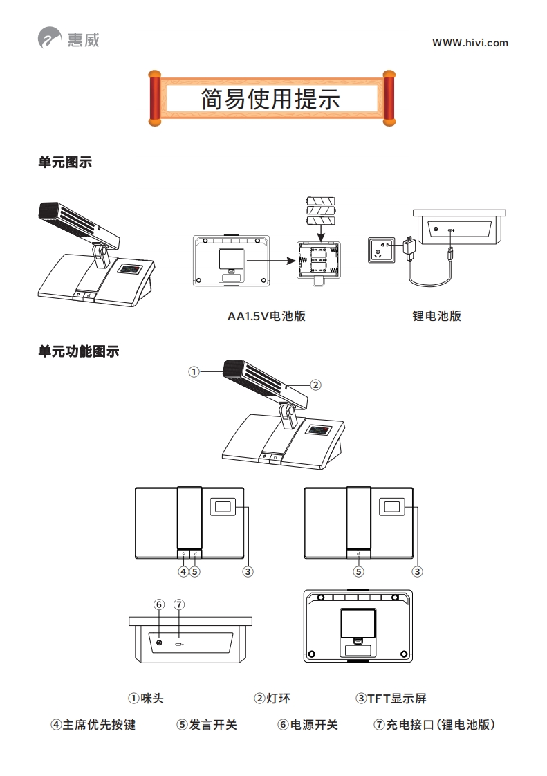 惠威WWW.hivi.com简易使用提示单元操作指示1、打开底部电池盖,装入3节AA1.5V电池,注意电池的正负极性不能装反;锂电池版的单元可直接开机。2、轻触电源开关,TFT显示屏和灯环变亮,表明单元正常开启。3、打开单元后,TFT显示屏显示实时的工作状态。4、关闭单元电源,只需轻触开关键即可。5、按下主席优先按键,可关闭开启中的代表单元而主席单元不受影响。主席单5%先进先出发言中房间:1625.60MHz通道:01信道:003主机与单元匹配设置一、系统主机界面设置主机和单元开机,按翻页键“NEXT”两次,进入系统设置界面。按确认键“ENTER”,设置选项内容闪烁一下,以色块背景显示,按向上键“▲”或向下键“”可在“系统语言设置、房间号设置”2个选项中移动选择再按向左键“”或向右键“”,可调节所选选项中所需的语言或数值。1、系统语言设置:具有“中文”和“English”两种语言可供选择。2、房间号设置:共20个房间号,每个房间号都有固定的通信P和通信ID。3、在设置完通信IP和通信ID之后,按确认键“ENTER”确认保存,所有主席和代表单元都会接收到更改设置指令,带显示屏的单元显示屏显示的房间号数值与主机设置的数值一致,或不带显示屏的单元所有的指示灯点亮一下,都可以说明更改设置成功。注意:当需要更改房间号时,必须要求每个主席、代表单元在“连接中”的状态下进行更改设置,当房间号更改确认后,重复按“发言键”进行自动寻频连接。想了解更多产品信息,请扫以下二维码▣▣惠威专业音响-网站惠威专业音响订阅号惠威专业音响说明书