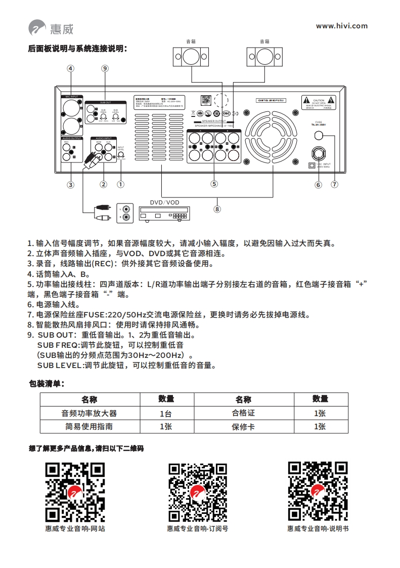 惠威www.hivi.com简易使用指南前面板说明:891010121314HiVi HE-860pOFESSOALAUOSSTEM51699♀18①电源开关(POWE);按到“”状态接通电源,按到“O”状态切断电源。(注:操作前请仔细检查一遍连线,确认无误后,方可接上电源,打开电源开关)②话筒混响(ECHO)隐藏式调节;DELAY BALANCE:调节L/R混响延时的时间差。DELAY:调节混响延时时间。REPEAT:调节混响的回声次数。③话筒音色(MIC ADJ)隐藏式调节;BASS:调节此旋钮可使话筒低频得到提升或衰减。MID:调节此旋钮可使话筒中频得到提升或衰减。TREBLE:调节此旋钮可使话筒高频得到提升或衰减。④话筒输入插孔(MIC INPUT)将话筒插入就可以进行卡拉OK演唱(当不使用话筒时,请把相应插头拔下,避免啸叫⑤话筒增益(MIC LEVEL)隐藏式调节;M1C1:调节话筒MIC1输入的增益。MIC2/A:调节话筒MIC2/A输入的增益。MIC3/B:调节话筒M1C3/B输入的增益。⑥音乐音色(MUSIC ADJ)隐藏式调节;BALANCE:调节此旋钮,可使用主声道喇叭平衡输出。BASS:调节此旋钮,可使主声道低频得到提升或衰减。TREBLE:调节此旋钮,可使主声道高频得到提升或衰减。⑦USB:开机后,插入U盘/读卡器,系统优先播放U盘内容。(开机前插入U盘,需要按"MODE"键选择MP3播放)⑧MP3显示屏话⑨输入选择(INPUT)按键独立切换选择AUTO、BGM、AUX输入信号。(显示屏会显示相对应输入模式)⑩FBX反馈抑制选择键,按动循环选择3档反馈抑制,长按可设置开机默认参数。①LCD液晶显示器,显示各种信息和各种模式调节对应的参数。②筒音量(M1 CVOLUME)调节旋钮;旋转此旋钮,可提升或衰减话筒音量(当不使用话筒时,请把音量调至最小)⑧混响音量(ECHO VOLUME)调节旋钮;旋转此旋钮,可增加或减小话筒混响幅度。④音乐音量(MUS1 CVOLUME)调节旋钮;主声道喇叭音量控制,顺时针方向旋转音量渐大,反之则渐小。⑤、:上一首(短按)/音量减(长按)⑤·:播放/暂停⑦州:下一首(短按)/音量加(长按)⑧MODE:菜单键。温馨提示:1、蓝牙连接方法:先按MODE按键,显示BLUE字样,打开手机蓝牙功能,搜索到名字为"HE-86O0"的设备后点击连接,连接成功后就能使用手机播放功能。2、仅支持使用16G以下U盘。