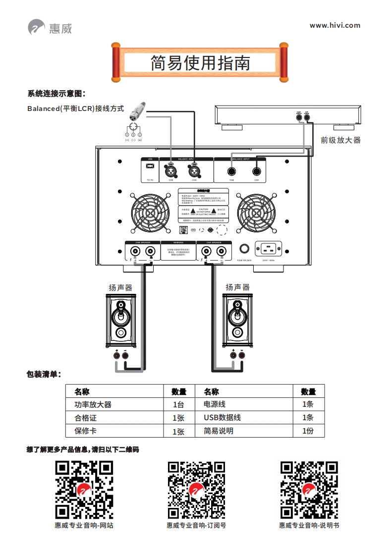 惠威www.hivi.com简易使用指南前面板/背板(5SWAN912①电源开关/电源指示灯/保护指示灯⑤通道B非平衡输入⑨通道A功率输出②USB接口(电脑控制端口)⑥通道A非平衡输入0断路器/复位③通道B平衡输入⑦通道B功率输出①电源输入④通道A平衡输入⑧警告标识②散热风扇软件说明本机背板上的USB除连接电脑功能外,还具备硬件的软件升级功能(OTG功能)。登录本公司专业网站www.hivi.com/pro下载本机控制软件的最新版本,安装到电脑里。OTG功能升级步骤:步骤一:登录惠威专业网站下载“HF.bin”软件;步骤二:把“HF.bin”软件拷贝到U盘;步骤三:拔掉电源线,然后插上U盘;步骤四:重新插上电源线,开机,功放开始自动升级,等待30秒左右升级成功!温馨提示:使用前必须连接电脑,软件调好参数才能使用。生义5包国E独POTIVT17司同Maa后4M具a+D