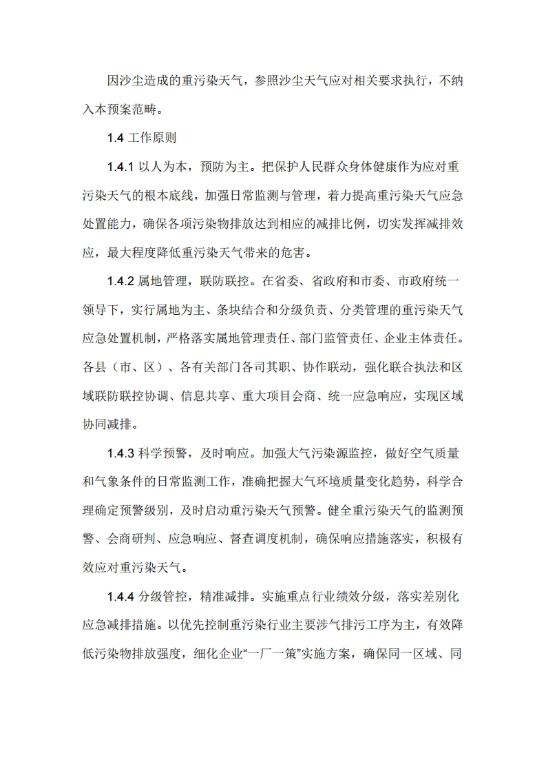 新乡市重污染天气应急预案1总则1.1编制目的为统筹全市重污染天气应急处置工作,提高预防、预警和应对能力,落实应急减排措施,及时有效控制、减少或消除重污染天气带来的危害,更好保障人民群众身体健康和经济社会高质量发展,制定本预案。1.2编制依据《中华人民共和国环境保护法》《中华人民共和国大气污染防治法》《中华人民共和国突发事件应对法》《中共中央国务院关于深入打好污染防治攻坚战的意见》《关于印发深入打好重污染天气消除、臭氧污染防治和柴油货车污染治理攻坚战行动方案的通知》(环大气〔2022)68号)、《生态环境部办公厅关于印发重污染天气重点行业应急减排措施制定技术指南(2020年修订版)的函》(环办大气函〔2020)340号)、《河南省大气污染防治条例》《河南省气象灾害防御条例》《河南省人民政府关于印发河南省突发事件总体应急预案(试行)的通知》(豫政〔2021)23号)、《中共河南省委河南省人民政府关于深入打好污染防治攻坚战的实施意见》《河南省人民政府办公厅关于印发河南省重污染天气应急预案的通知》(豫政办(2023)52号)、《河南省重污染天气重点行业应急减排措施制定技术指南(2021年修订版)》(豫环文〔2021)94号)、《新乡市大气污染防治条例》等。1.3适用范围本预案适用于新乡市行政区域内的重污染天气应急处置工作。