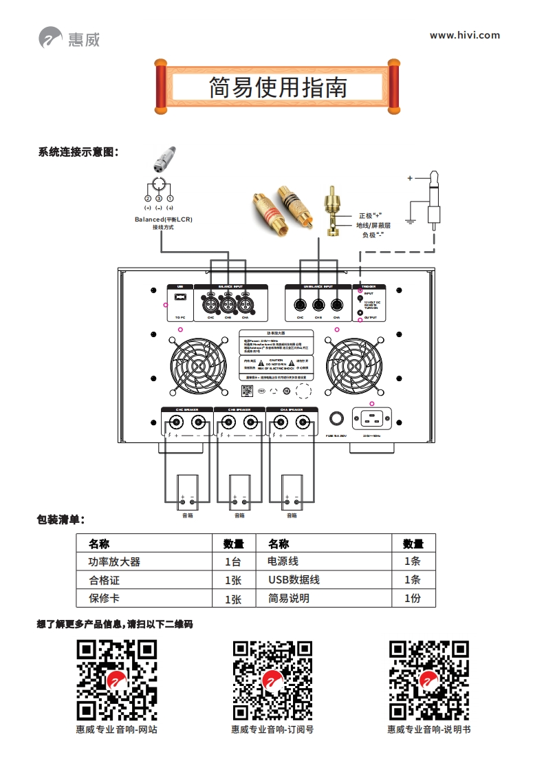 惠威www.hivi.com简易使用指南前面板/背板②③④⑤6⑦8⑨SWAN可(11112131415①电源开关/电源指示灯/保护指示灯⑥通道C非平衡输入①通道B功率输出②USB接口(电脑控制端口)⑦通道B非平衡输入②通道A功率输出③通道C平衡输入⑧通道A非平衡输入⑧断路器/复位④通道B平衡输入⑨12V触发输入/输出端口④电源输入⑤通道A平衡输入⑩通道C功率输出⑤散热风扇软件说明本机背板上的USB除连接电脑功能外,还具备硬件的软件升级功能(OTG功能)。登录本公司专业网站www.hivi.com/pro下载本机控制软件的最新版本,安装到电脑里。OTG功能升级步骤:步骤一:登录惠威专业网站下载“HF.bin”软件;步骤二:把“HF.bin”软件拷贝到U盘;步骤三:拔掉电源线,然后插上U盘;步骤四:重新插上电源线,开机,功放开始自动升级,等待30秒左右升级成功!温馨提示:使用前必须连接电脑,软件调好参数才能使用。过3发外少以生义5包国OTIVT1可司同Maa后4M具a+D