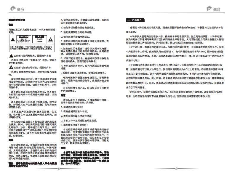 惠威功率放大器HF3380dSWAN设计Design HM-Swan6刺遗商Mc©c珠海惠蓝料技有限公同地址≤:珠海市联港工业区东成路南1号电话Rk00-0209199产品说明书www.hivi.com因设计变更等原因,所示资料可能与实物不符,想不另行通知。Due to the reasons in the change of design or others.product information containod here may not bein conformity with product itselt.We reserve the right df no prior notice before change.