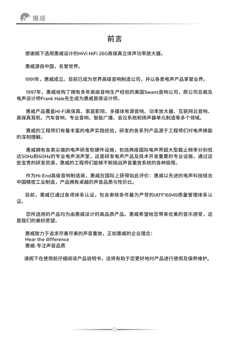 hivi惠威HiFi260使用说明书手册348072@abc6个月前发布关注私信5.14MB11页045hivi惠威HiFi260使用说明书手册此内容为付费资源,请付费后查看¥14¥24黄金会员免费钻石会员免费立即购买您当前未登录!建议登陆后购买,可保存购买订单付费资源 第1页 / 共11页 第2页 / 共11页 试读已结束,还剩9页,您可下载完整版后进行离线阅读 THE END说明书手册 文本预览 HiVi HiFi26O高保真立体声功率放大器产品说明书www.hivi.com 查看更多 收起部分 喜欢就支持一下吧收藏