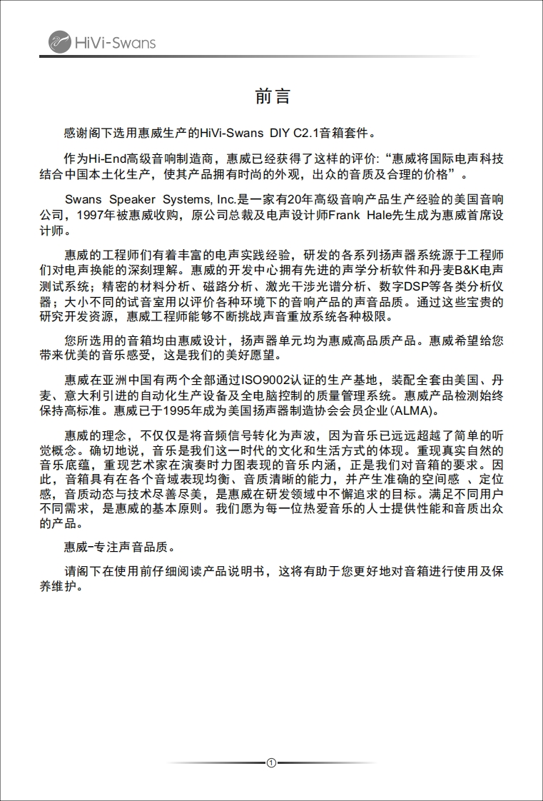 hivi惠威HiVi-SwansDIYC2.1音箱套件使用说明书手册(A版)-官网用348072@abc6个月前发布关注私信0.52MB8页028hivi惠威HiVi-SwansDIYC2.1音箱套件使用说明书手册(A版)-官网用此内容为付费资源,请付费后查看¥14¥24黄金会员免费钻石会员免费立即购买您当前未登录!建议登陆后购买,可保存购买订单付费资源 第1页 / 共8页 第2页 / 共8页 试读已结束,还剩6页,您可下载完整版后进行离线阅读 THE END说明书手册 文本预览 HiVi-Swans DIY C2.1音箱套件产品说明书www.hivi.com 查看更多 收起部分 喜欢就支持一下吧收藏