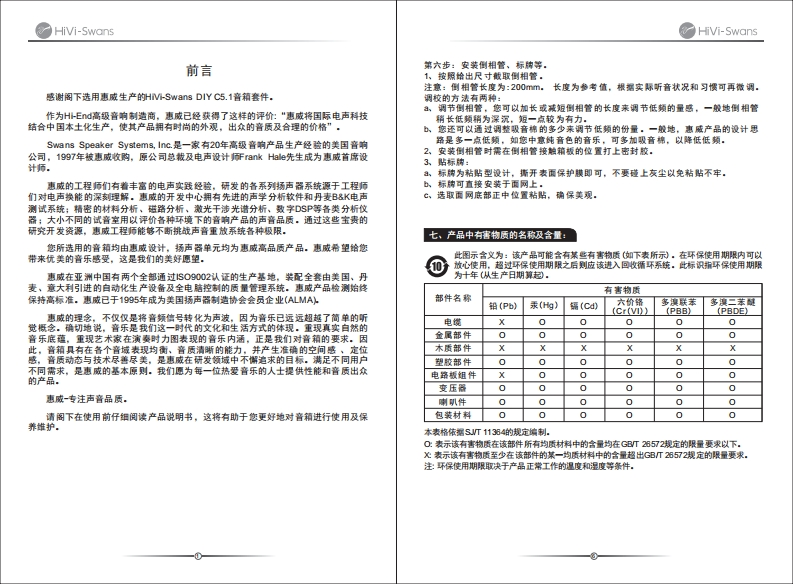 ▣之扫码关注惠威集团公众号HiVi-Swans DIY C5.1音箱套件注册产品即享保修产品说明书设t扣≤ign HViSwans刺造商血hcu@C珠海惠蓝料技有限公同地址Add©至珠海市联鬼工业区东成暗南1号电话打c400-0E0-919www.hivi.com因设计变更等原因,所录资料可能与实物不符,怎不另行通知。Due to the reasons in the change of design or others,product information contained here may not be