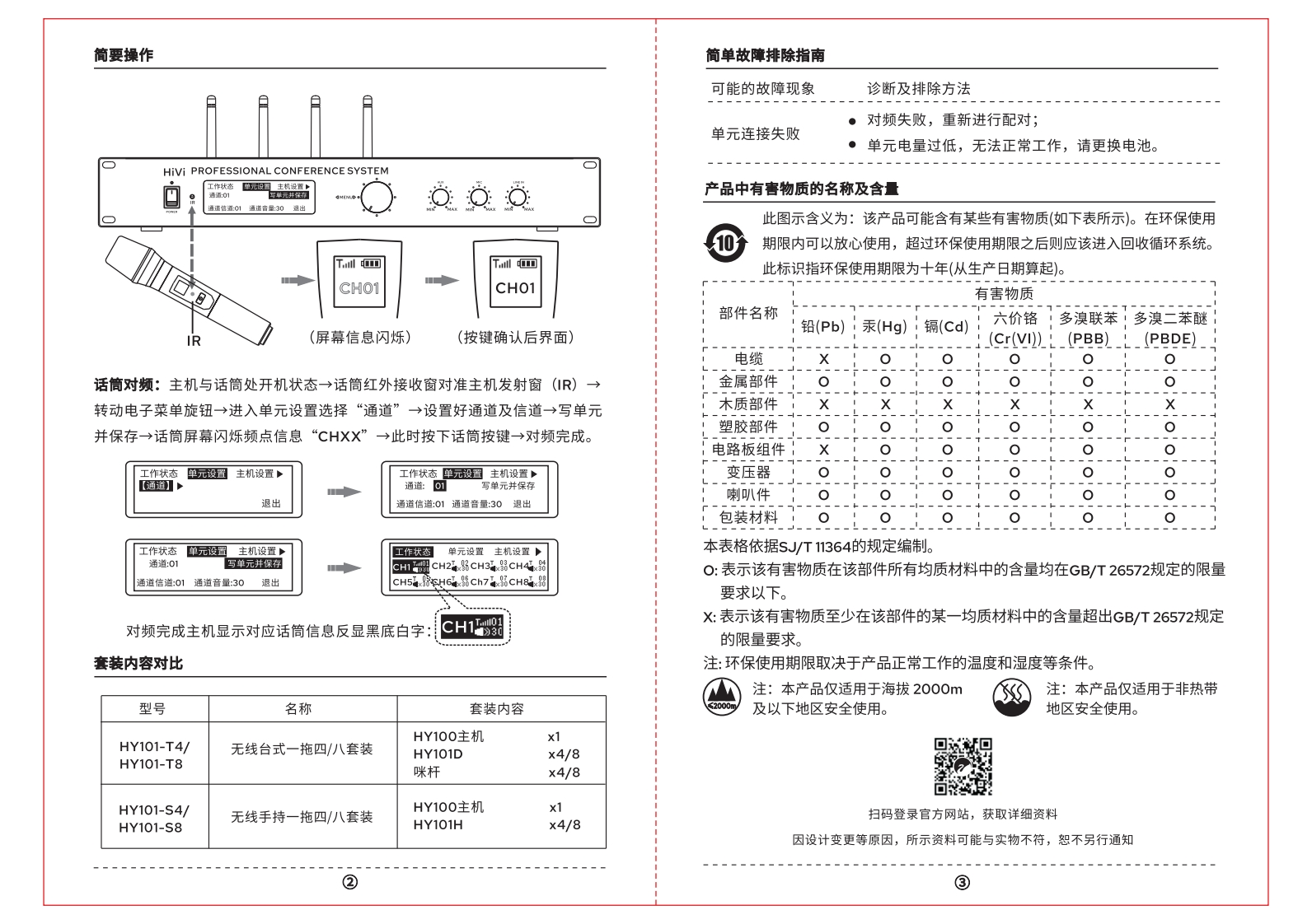 功能说明全数字无线会议系统HY1O1H产品说明书正面底部一、手持话筒示意图1.咪头2.显示屏3.红外窗(IR)4.按键(长按开关机)5.旋盖式电池仓6.串口二、附件口口巴1保修卡2、合格证3、说明书单元简要参数音频延时:2.5毫秒频段:UHF电池:2节AA干电池尺寸:245*53mm(最大直径)裸机重量:0.23Kg珠海惠威科技有限公司灵敏度:-70dB±3dB(odB=1V/ubar at1KHz)广东珠海市联港工业区大林山片区东成路南1号工作时长:满电发言时长≥6h电话、传真:0756-6268151客户服务热线:400-021-5108①