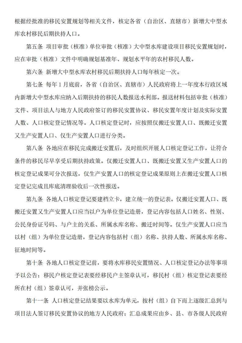 水利部关于印发《新增大中型水库农村移民后期扶持人口核定登记办法》的通知各省、自治区、直辖市水利(水务)厅(局)和新疆生产建设兵团水利局、水利水电工程移民行政管理机构:为贯彻落实《国务院关于完善大中型水库移民后期扶持政策的意见》(国发(2006)17号),切实做好2006年7月1日以后新建大中型水库农村移民后期扶持人口核定登记工作,水利部经商国家发展改革委、财政部同意,对《新建大中型水库农村移民后期扶持人口核定登记暂行办法》(发改农经(2007)3718号)进行了修订,制定了《新增大中型水库农村移民后期扶持人口核定登记办法》。现予发布,请按照执行。水利部2022年1月10日附件新增大中型水库农村移民后期扶持人口核定登记办法第一条根据《大中型水利水电工程建设征地补偿和移民安置条例》和《国务院关于完善大中型水库移民后期扶持政策的意见》(国发〔2006)17号)要求,为做好新增大中型水库农村移民后期扶持人口核定登记工作(以下简称人口核定登记),制定本办法。第二条本办法适用于2006年7月1日以后审批(核准)的大中型水库新增移民后期扶持人口的核定登记工作。第三条人口核定登记以经批准的移民安置规划为基本依据,坚持依法依规、公开透明、实事求是的原则。第四条人口核定登记实行属地管理,由省级人民政府负总责;县级以上地方人民政府负责本行政区域内人口核定登记工作的组织和实施。水利部会同国家发展改革委,