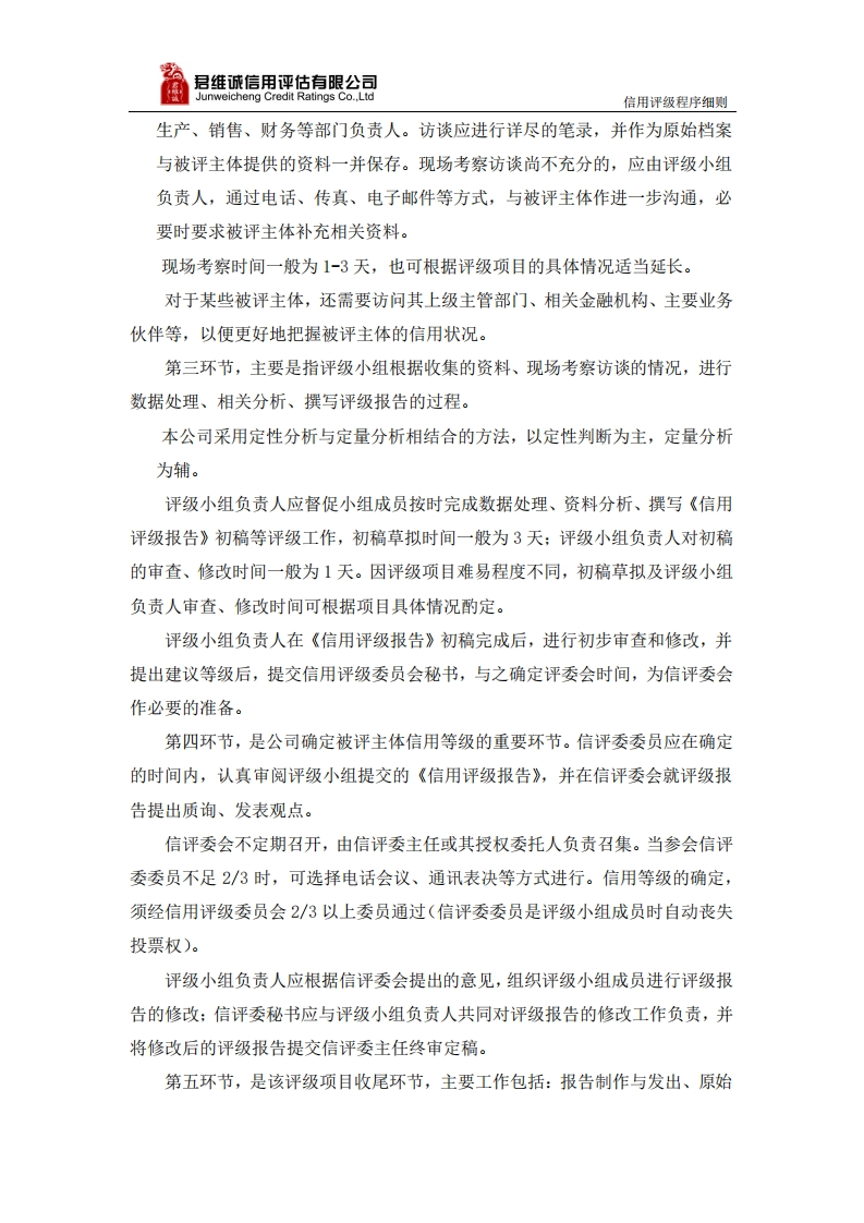 裙维诚信用评估有限公司Junweicheng Credit Ratings Co.,Ltd信用评级程序细则信用评级程序细则第一章总则第一条为使信用评级工作建立在严谨、规范、科学的基础上,更好地为投资人提供专业化的评级意见,特制定本细则。第二条本细则是在充分考虑了中国现有的政策环境、法律法规、企业制度、会计制度等因素,并参考了国际著名评级机构的评级理念和技术基础上制定的,是本公司所有信用评级业务遵从的基本程序。第二章评级程序第三条信用评级的程序分五个环节,具体如下:前期现场数据评委制作准备考察处理审阅发递治商交换相关评委保密第一环节,前期准备是在客户或委托方向本公司提出信用评级委托,并与本公司签订《信用评级委托协议书》后,由公司根据组建评级小组,着手受托评级项目实施的相关准备工作。评级小组一般由2-4人组成,其中一名为项目负责人,负责评级项目的协调组织、资料收集、数据处理、撰写报告、初步审查、补充修改等工作。资料收集具体包括两个方面,一是外部资料,主要是涉及被评主体所处行业的发展动态、国家相关政策、行业运营特征、行业组织形态、市场分布及趋势等。二是内部资料,主要是指被评主体按本公司制定的资料清单,提交的公司章程、管理制度、经营情况、财务报告等有关资料。第二环节,现场考察是指评级小组到被评主体现场实地考察被评主体的管理水平、技术装备水平、生产经营状况、项目进展情况,并与被评主体有关管理人士交换意见。与被评主体有关管理人士的沟通,应涉及企业主要负责人,以及研发、