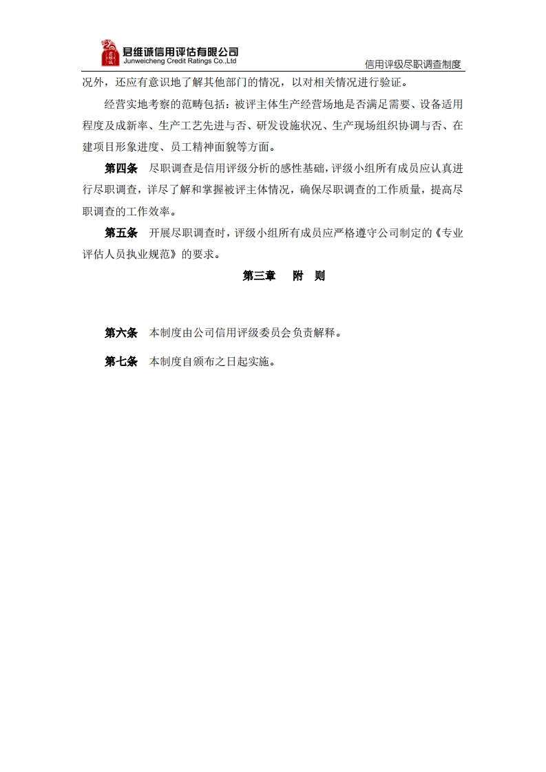 裙维诚信用评估有限公司Junweicheng Credit Ratings Co.,Ltd信用评级尽职调查制度信用评级尽职调查制度第一章总则第一条为保证公司信用评级业务的独立、客观、公正性,规范公司评级人员的尽职调查行为,为评级分析奠定坚实基础,特制定本制度。第二条本制度适用于公司开展的各种评级业务。第二章尽职调查细则第三条为使尽职调查达到预期目标,评级小组应做好以下几方面工作:(一)事前准备阶段,评级小组应根据被评主体的性质,制作并发送评级资料清单:在对被评主体提供的评级资料进行认真研究的基础上,与被评主体讨论、确定实地考察的基本程序、访谈对象及内容,并以书面形式列出访谈时间安排、访谈要点提纲发至被评主体。(二)实地调查阶段包括管理层沟通和经营实地考察两个方面。管理层沟通的对象主要包括:被评主体的主要负责人,以及研发、生产、销售、财务等部门负责人。管理层沟通的主要内容包括、但不限于被评主体提供的评级资料,以及评级小组与被评主体确定应交换意见的相关范畴。评级小组应就被评主体经营历史、未来发展战略、技术研发实力、生产经营状况、市场竞争地位、内部管理状况、成本费用控制、未来经营计划如何实现、突发事件的应对能力、危机处理能力、风险控制手段、外部支持力度,以及财务质量、盈利能力和偿债能力等方面情况与被评主体进行深入的沟通。评级小组应在交换意见过程中,及时发现可能影响被评主体信用能力和意愿的信息,并要求被评主体做出合理解释。评级小组与被评主体相关管理部门负责人交换意见过程中,除了解该部门情