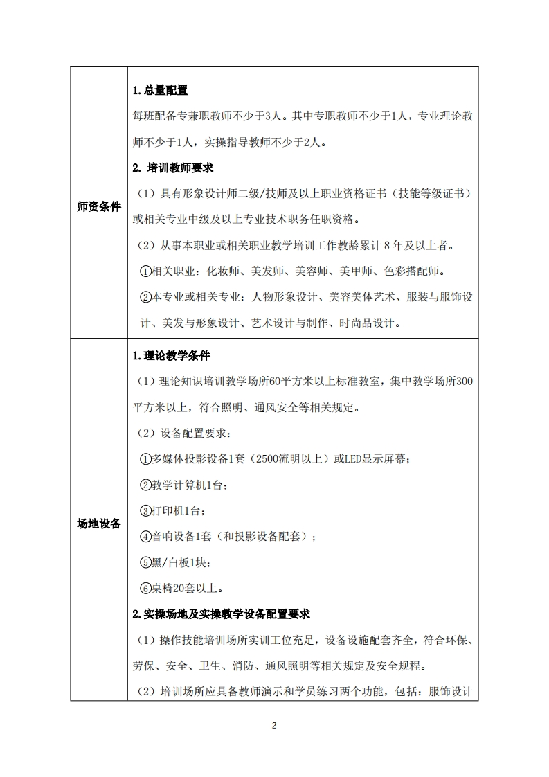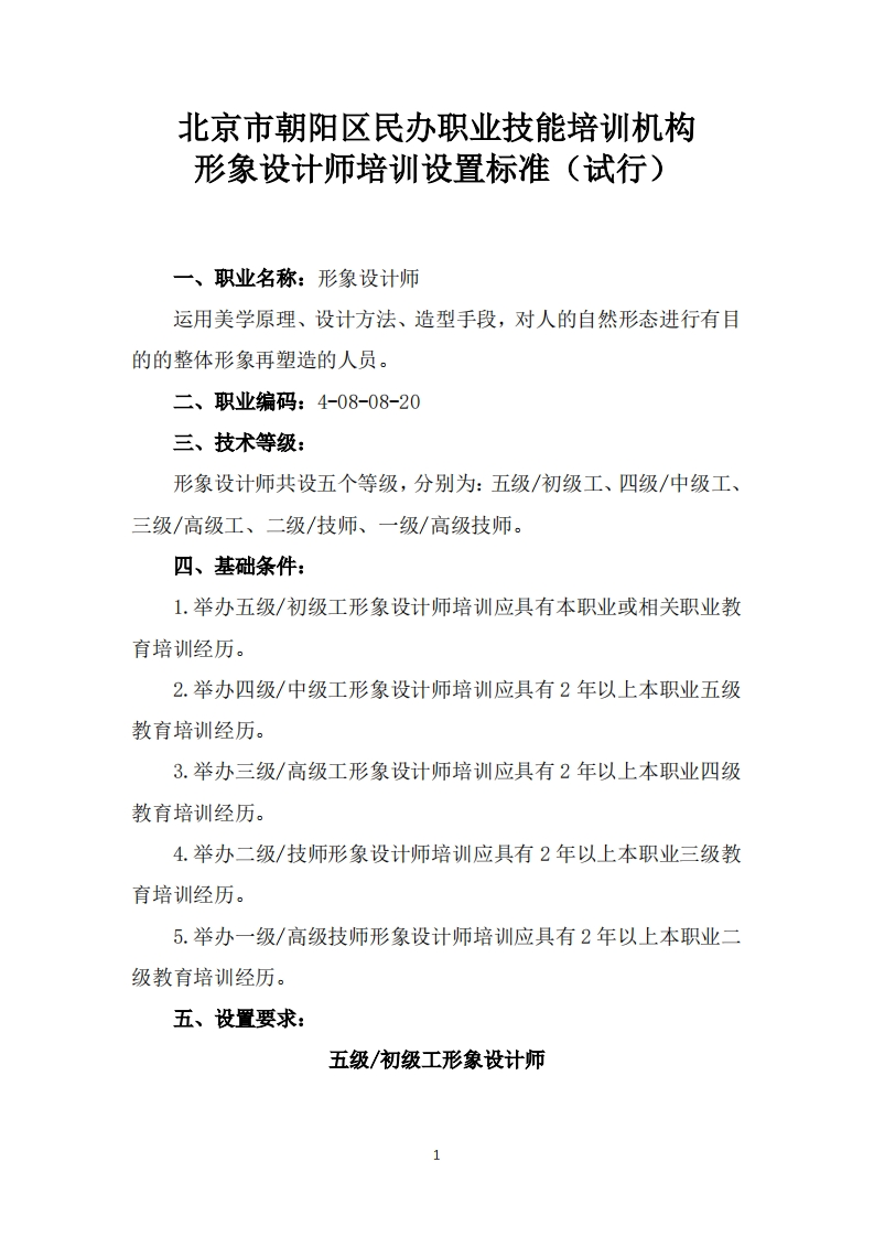 北京市朝阳区民办职业技能培训机构形象设计师培训设置标准(试行)一、职业名称:形象设计师运用美学原理、设计方法、造型手段,对人的自然形态进行有目的的整体形象再塑造的人员。二、职业编码:4-08-08-20三、技术等级:形象设计师共设五个等级,分别为:五级/初级工、四级/中级工、三级/高级工、二级/技师、一级/高级技师。四、基础条件:1.举办五级/初级工形象设计师培训应具有本职业或相关职业教育培训经历。2.举办四级/中级工形象设计师培训应具有2年以上本职业五级教育培训经历。3.举办三级/高级工形象设计师培训应具有2年以上本职业四级教育培训经历。4.举办二级/技师形象设计师培训应具有2年以上本职业三级教育培训经历。5.举办一级/高级技师形象设计师培训应具有2年以上本职业二级教育培训经历。五、设置要求:五级/初级工形象设计师