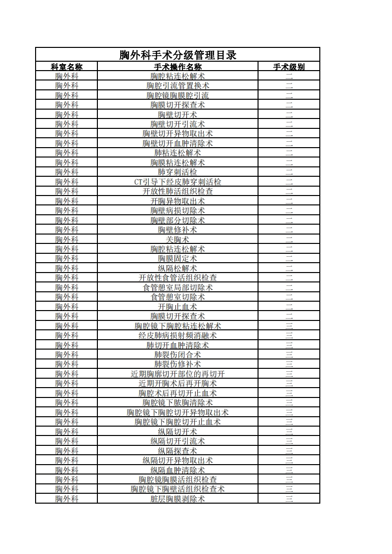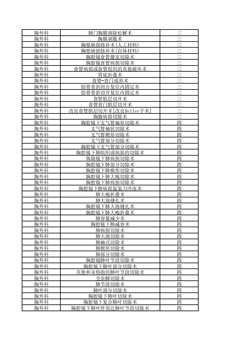 胸外科手术分级管理目录科室名称手术操作名称手术级别胸外科胸腔粘连松解术胸外科胸腔引流管置换术胸外科胸腔镜胞膜腔引流胸外科胸膜切开探查术胸外科胸壁切开术二胸外科胸壁切开引流术胸外科胸壁切开异物取出术胸外科胸壁切开血肿清除术胸外科肺粘连松解术二胸外科胸膜粘连松解术二胸外科肺穿刺活检胸外科CT引导下经皮肺穿刺活检胸外科开放性肺活组织检查胸外科开胸异物取出术胸外科胸壁病损切除术胸外科胸壁部分切除术二胸外科胸壁修补术二胸外科关胸术一胸外科胸腔粘连松解术胸外科胸膜固定术胸外科纵隔松解术胸外科开放性食管活组织检查胸外科食管憩室局部切除术二胸外科食管憩室切除术胸外科开胸止血术胸外科胸膜切开探查术胸外科胸腔镜下胸腔粘连松解术三胸外科经皮肺病损射频消融术三胸外科肺切开血肿清除术三胸外科肺裂伤闭合术三胸外科肺裂伤修补术胸外科近期胸廓切开部位的再切开三胸外科近期开胸术后再开胸术三胸外科胸腔术后再切开止血术三胸外科胸腔镜下脓胸清除术三胸外科胸腔镜下胸腔切开异物取出术三胸外科胸腔镜下胸腔切开止血术三胸外科纵隔切开术三胸外科纵隔切开引流术三胸外科纵隔探查术三胸外科纵隔切开异物取出术三胸外科纵隔血肿清除术三胸外科胸腔镜胸膜活组织检查三胸外科胸腔镜下胸壁活组织检查术三胸外科脏层胸膜剥除术三