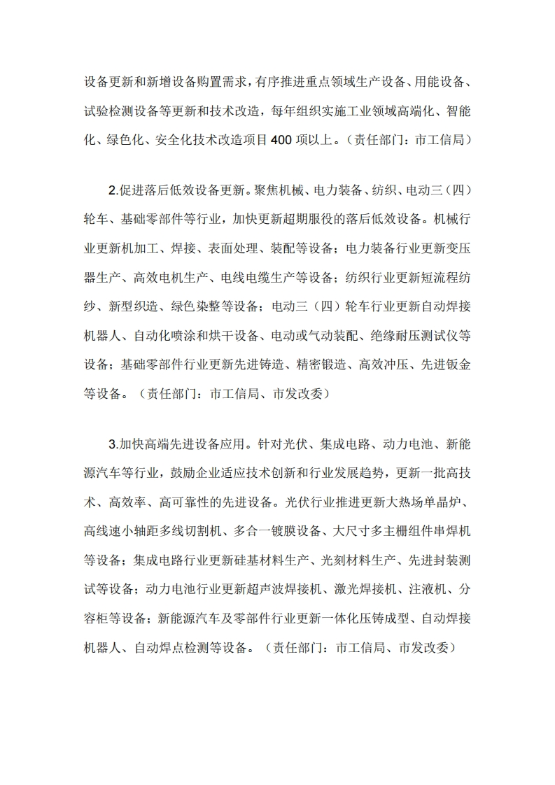 徐州市推动工业领域设备更新实施方案为贯彻落实国务院《推动大规模设备更新和消费品以旧换新行动方案》和省政府、市政府工作部署,加快推进我市工业领域设备更新和技术改造,制定本实施方案。一、工作目标坚持市场为主政府引导、鼓励先进淘汰落后、标准引领有序提升,统筹推进工业领域设备更新和技术改造,推动制造业高端化、智能化、绿色化发展,加快形成新质生产力,为推进新型工业化、构建现代化产业体系提供有力支撑。到2027年,全市工业领域设备投资规模较2023年增长30%左右,规模以上工业企业数字化研发设计工具普及率超过90%,重点企业关键工序数控化率超过75%,规模以上工业企业数字化改造全覆盖,主要用能设备能效基本达到节能水平,本质安全水平明显提升。二、重点任务(一)实施重点行业装备更新行动1.推进设备更新技改项目实施。围绕推进新型工业化,因地制宜发展新质生产力,聚焦我市“343”创新产业集群,全面深入摸排企业老旧