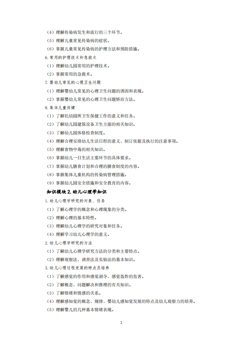 学前教育类专业知识考试标准一、考试范围和要求知识模块1.幼儿卫生学知识1.幼儿生理解剖特点及保有要求(1)了解人体各系统及感觉器官的基础知识。(2)理解人体免疫系统的功能及免疫作用的种类。(3)理解婴幼儿八大系统及感觉器官的生理特点。(4)掌握婴幼儿各系统及感觉器官的保育要点。2.婴幼儿的生长发有规律(1)了解儿童年龄阶段划分。(2)了解生长发育的含义。(3)理解婴幼儿生长发育的一般规律。(4)掌握影响婴幼儿生长发育的因素。(5)掌握儿童生长发育的常用评价指标、评价方法及测量方法。3.婴幼儿营养与膳食制度(1)了解营养素的概念及分类。(2)了解婴幼儿膳食中各类营养素的需要量。(3)了解1~6岁婴幼儿喂养指南。(4)理解热能的含义及儿童的热能消耗。(5)理解儿童缺乏营养素引起的疾病和症状。(6)理解母乳喂养的优越性。(7)理解添加辅食的目的和原则。(8)掌握各类营养素的生理功能和食物来源。(9)掌握配制幼儿膳食的原则和膳食搭配的方法。(10)掌握培养幼儿良好饮食习惯的方法。4.预防常见病(1)理解婴幼儿常见病的症状和病因。(2)理解婴幼儿常见病的护理方法。(3)掌握婴幼儿常见病的预防措施。5.预防传染病(1)了解传染病的概念和特性。(2)了解儿童常见传染病的流行特点。(3)了解预防接种的基础知识。