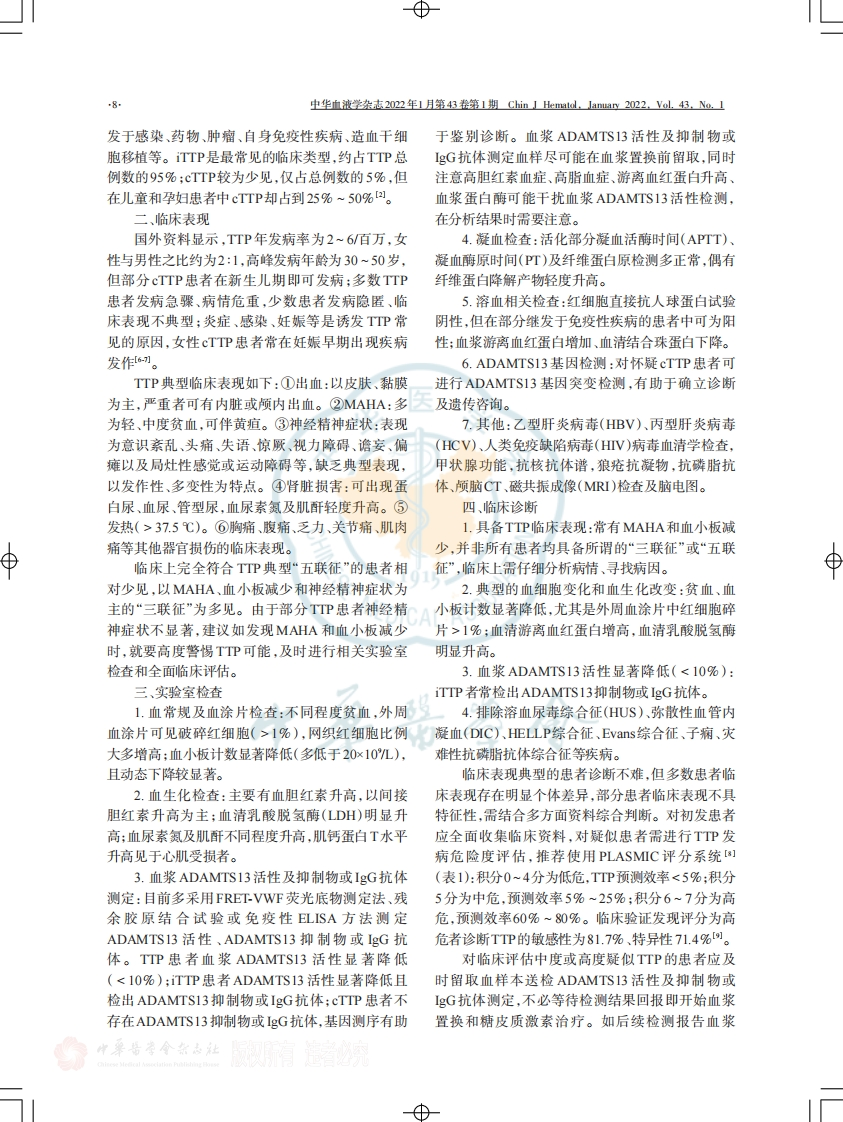 ⊕中生h液学杂志2022年L月第43卷第1期Chin1 Hematol.January2022,Val43.No.L7·标准与讨论·血栓性血小板减少性紫癜诊断与治疗中国指南(2022年版)中华医学会血液学分会血栓与止血学组通信作者:吴德沛,苏州大学附属第一医院、江苏省血液研究所、国家血液系统疾病临床医学研究中心、国家卫生健康委员会血栓与止血重点实验室、血液学协同创新中心,苏州大学造血千细胞移植研究所,苏州215006,Email:drwudepei@163.com;胡豫,华中科技大学同济医学院附属协和医院,武汉430022,Email:dr huyu@126.com;阮长耿,苏州大学附属第一医院、江苏省血液研究所、国家血液系统疾病临床医学研究中心、国家卫生健康委员会血栓与止血重点实验室、血液学协同创新中心,苏州大学造血干细胞移拉研究所,苏州215006,Email:changgengruan@hotmail.comD0I:10.3760/cma.j.isn.0253-2727.2022.01.002Chinese guideline on the diagnosis and management of thrombotic thrombocytopenicpurpura(2022)Thrombosis and Hemostasis Group,Chinese Society of Hematology.Chinese MedicalAssociationCorresponding author:Wu Depei.The First Affiliated Hospital of Soochow University.Jiangsu Institute of Hematology.National Clinical Research Center for Blood Diseases,⊕Collaborative Innovation Center of Hematology:Institue of Blood and MarrowTransplantation,Soochow University,Suzhou 215006.China,Email:drwudepei@163.com;Hu Yu Institute of Hematology,Union Hospital,Tongji Medical College,HuazhongUniversity of Science and Technology.Wuhan 430022,China,Email:dr huyu@126.com:Ruan Changgeng.The First Affiliated Hospital of Soochow University,Jiangsu Institute ofHematology:National Clinical Research Center for Blood Diseases,CollaborativeInnovation Center of Hematology,Institute of Blood and Marrow Transplantation,SoochowUniversity.Suzhou 215006,China,Email:changgengruan@hotmail.com一、概述而引起相应器官缺血、缺氧及功能障碍,引起临床血栓性血小板减少性紫癜(thrombotic症候群21。thrombocytopenic purpura,.TTP)为一种少见、严重的根据ADAMTS13缺乏机制不同,TTP分为遗传血栓性微血管病,其主要临床特征包括微血管病性性TTP(cTTP,又称为Upshaw-Schulman综合征)和溶血性贫血(MAHA)、血小板减少、神经精神症状、免疫性TTP(iTTP)。cTTP系ADAMTS13基因突变发热和肾脏受累等。TTP的发病机制主要涉及血导致血浆ADAMTS13活性缺乏.常在感染、炎症或管性血友病因子(VWF)裂解酶(ADAMTS13)活性妊娠等促发因素下发病。cTTP呈常染色体隐性遗缺乏,也与血管内皮细胞VWF异常释放、补体异常传,基因突变表现为纯合子型或双重杂合子型。活化,血小板异常活化等相关。血浆中ADAMTS13iTTP系因患者体内产生抗ADAMTS13自身抗体.活性缺乏导致内皮细胞异常释放的超大分子VWF抑制ADAMTS13活性(中和抗体)或与ADAMTS13(UL-VWF)不能及时降解,UL-VWF可自发结合血结合形成抗原抗体复合物而加速ADAMTS13在体小板,导致微血管内血栓形成、微血管病性溶血,进内清除。TTP多无明确原因(即原发性),也可能继