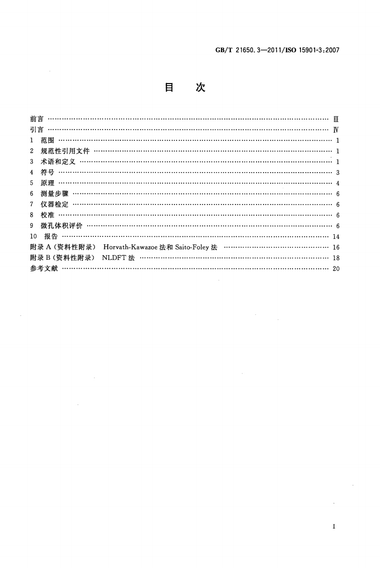 ICS19.120A28GB中华人民共和国国家标准GB/T21650.3-2011/1S015901-3:2007压汞法和气体吸附法测定固体材料孔径分布和孔隙度第3部分:气体吸附法分析微孔Pore size distribution and porosity of solid materials bymercury porosimetry and gas adsorption-Part 3:Analysis of micropores by gas adsorption(IS015901-3:2007,IDT)2011-06-16发布2012-03-01实施中华人民共和国国家质量监督检验检疫总局发布中国国家标准化管理委员会