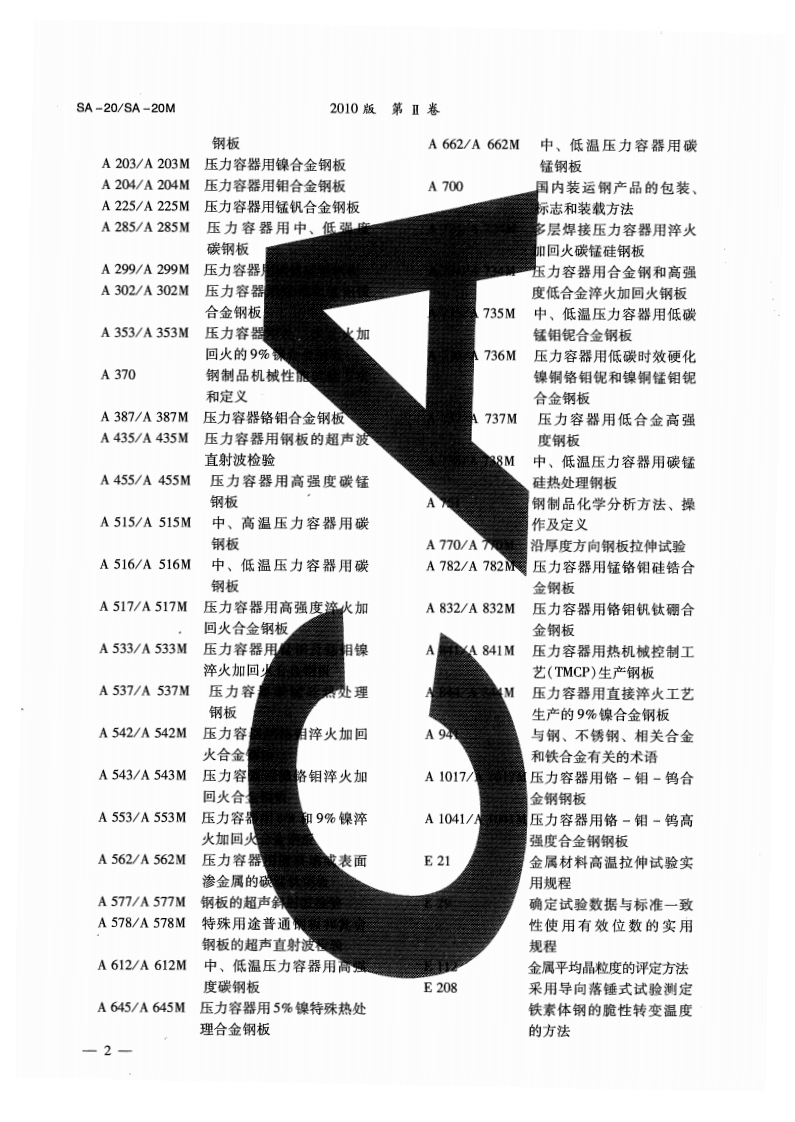 压力容器用钢板通用要求ASMESA-20/SA-20MFF程击gTe果年4。eeAe优(与ASTM标准A20/A20M06完全等同)1适用范围1.1.1本标准还包括一组补充要求,适用1.1本标准包括一组通用要求,除专用材料于上列若干个标准中本身已指明的场合。这些补标准中另有规定外,这些要求应适用于下列各项充要求仅当买方在订货单中要求附加试验或附加由ASTM发行的压力容器用轧制钢板标准:限制、并作了单独规定时采用。1.2附录X1提供了制造压力容器用钢板来标准名称ASTM标准号压力容器用格锰硅合金钢板A202/A202M源的卷材的资料。压力容器用镶合金钢板A203/A203M1.3附录X2提供了关于压力容器用钢板拉压力容器用相合金解板A204/A204M伸性能变化性的资料。压力容器用锰钒合金钢板A225/A225M1.4附录X3提供了关于压力容器用钢板夏压力容器用中、低强度碳钢板A285/A2R5M比V形缺口冲击试验性能变化的资料。压力容器用碳锰硅钢钢板A299/A299M压力容器用锰钼和锰钼磔合金钢板A302/A302M1.5附录X4提供了包括冷弯时建议的最小压力容器用经二次正火加回火的9%缺合金钢板A353/A353M内弯曲半径在内的有关钢板冷弯的资料。压力容器用铬钼合金钢板A387/A387M1.6这些材料仅适于熔焊,熔焊时应采用适压力容器用高强度碳锰钢板A455/A455M合于该钢种级别及使用条件的焊接工艺。中、高湿压力容器用碳钢板A515/A515M1.7如本标准与专用材料标准的要求不一中、低温压力容器用碳钢板A516/A516M压力容器用高强度滓火加回火合金钢板A517/A517M致,则以专用材料标准的要求为准。压力容器用锰相镍裤火加回火合金钢板A533/A533M1.8买方可以规定不否定本标准或专用材料压力容器用碳锰硅热处理钢板A537/A537M标准任何条款的附加要求。这些附加要求必须纳压力容器用修相淬火加回火合金钢板A542/A5S42M人采购订货单说明中,并取得供方同意。压力容器用像格相淬火加回火合金锅板A543/A543M1.9为了确定供应材料是否与标准及材料标压力容器用8%和9%镍滓火加回火合金钢板A553/A553M压力容器用墙玻璃或表面渗金属的碳锰钛钢板A562/A562M准的规定极限值相一致,各数值右面的有效位数中、低温压力容器用高强度碳钢板A612/A612M应按E29推荐的圆整方法进行圆整。压力容器用5%镍特殊热处理合金钢板A645/A645M1,10以英寸-磅单位或SI单位表示的数值均中、低温压力容器用读锰钢板A662/A662M可作为标准值。本文中S单位表示于括号内。由多层焊接压力容器用淬火加回火碳锰硅钢板A724/A724M于各单位制所表示的数值不能与另一种单位制进行压力容器用合金和高强度低合金淬火加回火A734/A734M中、低湿压力容器用低碳锰相银合金钢板A735/A735M精确换算,因此,每一种单位制必须独立使用。压力容器用低碳镍铜锰钼倪时效硬化合金钢板A736/A736M1,11本标准及所引用的材料标准均采用英压力容器用低合金高强度钢板A737/A737M寸一磅和S两种单位,但除非订货单中规定采中低耳压力容器用碳锰硅热处理解板A738/A738M用“M”标志(SI单位),材料将以英寸-磅单压力容鞋用锰铬相硅皓滓火加回火合金钢板A782/A782M位供货。压力容器用铬相钒钛理合金钢板A832/A832M压力容器用热机械控制工艺(TMCP)生产钢板A841/A841M2引用标准压力容器用直接粹火工艺生产的9%镍合金钢板A844/A844M压力容器用铬~钼一钨合金钢钢板A1017/A10I7M2.1ASTM标准:压力容器用格一相-钨高强度合金钢钢板A1041/A1041MA202/A202M压力容器用铬锰硅合金一1