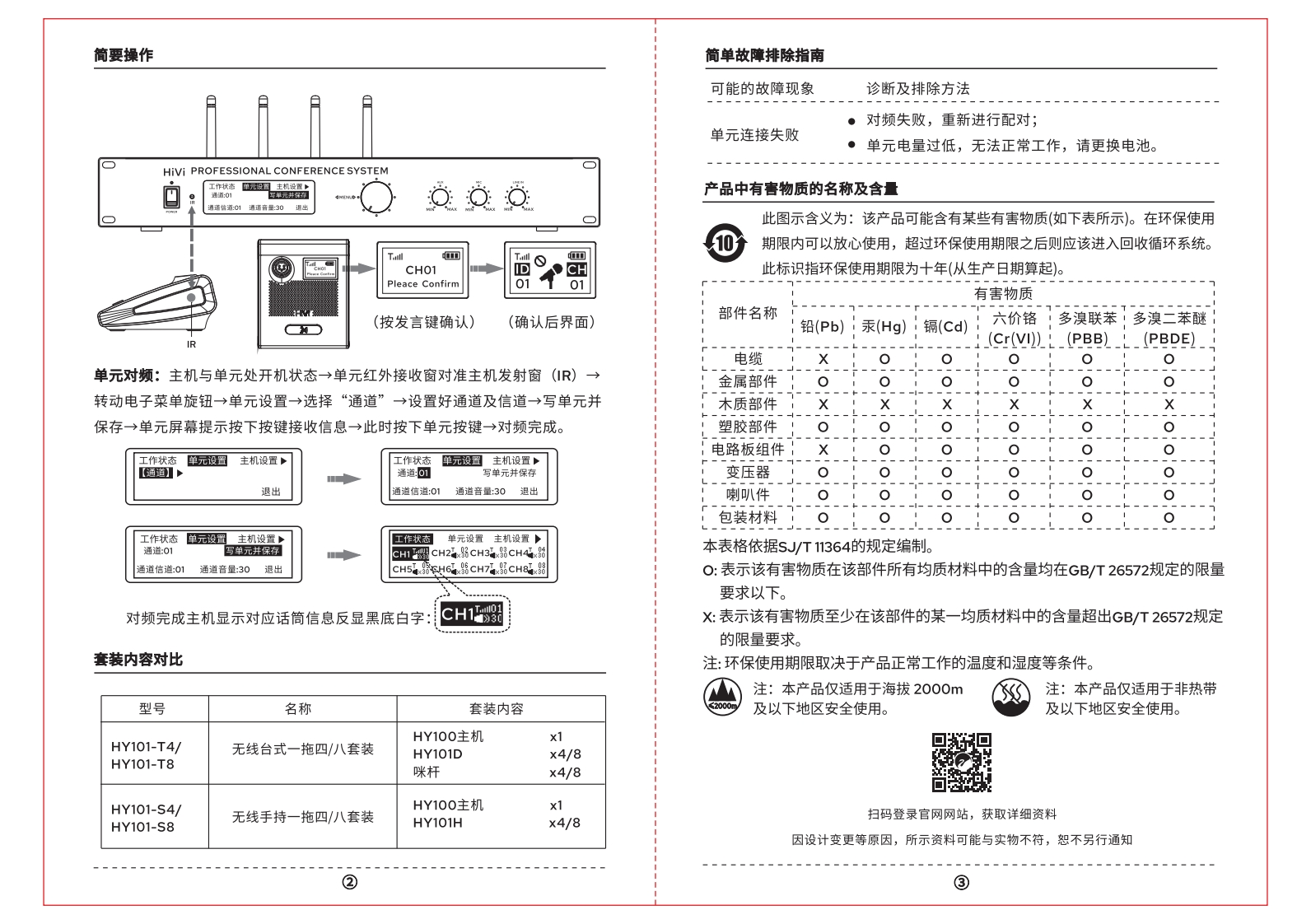 功能说明2全数字无线会议系统3HY1O1D产品说明书4一、台式单元示意图1.咪杆(标配长度410mm)2.128*64黑底白字0LED显示屏3.发言键(长按开关)4.LED双色指示灯5.橡胶垫脚6.可拆卸电池盖7.R红外接收窗《图二、附件1、保修卡2、合格证3、说明书单元简要参数音频延时:2.5毫秒频段UHF电池:3节AA干电池尺寸:110*130*60mm裸机重量:0.42Kg灵敏度:-46dB±1dB珠海惠威科技有限公司工作时长:满电发言时长≥6h广东珠海市联港工业区大林山片区东成路南1号电话、传真:0756-6268151客户服务热线:400-021-5108拾音距离:100-600mm(参考距离)①