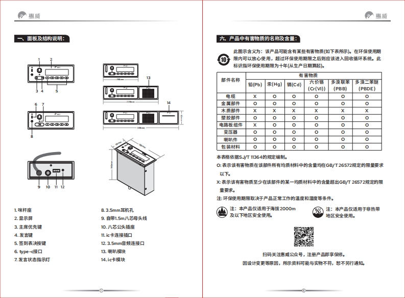 惠威全数字嵌入式会议单元(HCS4300 MANUAL)设计Dei好m:事殿制造商Manufactuter:珠海惠蓝科技有用公司产品说明书地地A妇0丝:珠海市联港工业区东成路潮号www.hivi.com电话Tl:400-090-9引99 www.Jhivi.com女因设计度更等原因。所示资料可能与实物不符。越不另行通完。Due to the reasons in the change of de signor others,pro duct inform ation contained here may notbeinconformity withproductitself.Wereserve the right of noprior notice before change.
