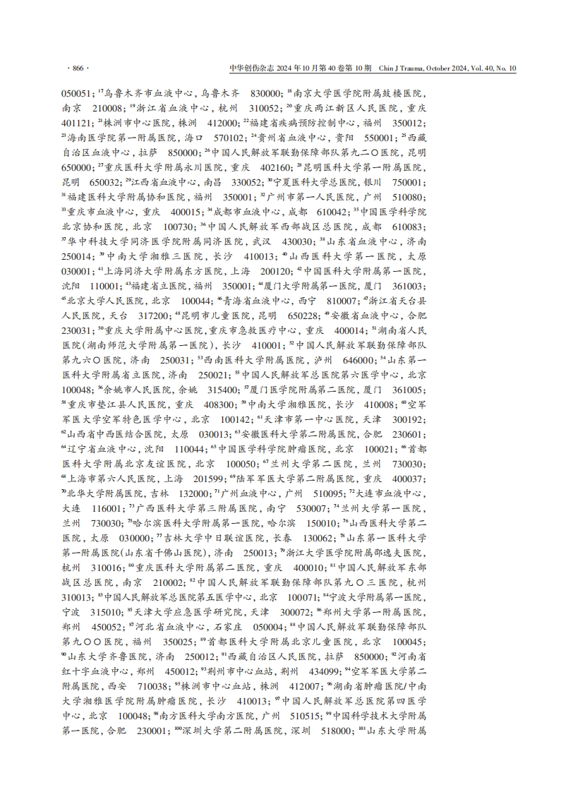 中华创伤杂志2024年10月第40卷第10期Chin J Trauma,0eber2024.Val.40.Na.10·865·共识与指南·严重创伤患者紧急救治血液保障模式与输血策略中国专家共识(2024版)卢尧!李阳口张雷英3唐吴'敬慧丹·王耀丽贾向志4巴立5卞茂红6蔡丹蔡辉8蔡晓红”查占山0陈秉宇”陈大庆2陈凤日陈国安4陈海鸣5陈静6陈敏”陈青陈舒”陈玺”程金凤1褚晓凌”崔红旺四崔欣4达珍5戴莹“邓素容”董伟群范为民”冯珂0付丹晖引付涌水卫傅奇3傅雪梅4甘佳5甘新宇6高伟刃玩怀证38桂嵘》郭庚”韩宁郝一文”何武兵好洪强州侯瑞琴5侯卫“胡婕3胡培阳”胡熙8胡晓玉”黄光斌”黄婕黄象艳如黄远帅和浑守永4蒋学兵$金平”赖冬刀乐爱平5黎红梅8李碧娟别李翠莹①李代红1李海宏2李贺李辉0李剑平64李宁”李喜莹的李湘民别李小飞“李晓娟幻李志强⑧李忠俊”李尊严”梁华钦”梁晓华”廖冬发廖群。廖燕为林甲进2刘春霞4刘凤华5刘培贤6刘铁梅”刘小信刘志伟”刘中砥5陆华0来建凤1骆建军2骆群3吕定丰4吕琪珙5吕先萍“马爱军”马立强器马躇轩”马现君马小刚”马晓莉如毛国庆归穆士杰叫聂少林5欧阳淑娟%欧阳锡林”潘春球⅓潘健”潘晓华彭磊1彭涛钱宝华。乔妹@秦莉⑧任颖。任召祺:戎瑞明“苏常山6孙明伟网孙文武2孙振威s唐海平m唐晓峰m唐长玖陶翠华口田志彬?汪娟4王宝燕5王春燕6王革非趾王海燕”王鸿捷Ⅲ王鹏王鹏里®王秋实☒王晓宁四王新华王学锋”王勇王勇军4王远杰5王志华器韦少俊s魏亚明?文键波2器文军四吴江①吴巨峰1夏爱军2夏飞田夏荣4谢珏s那颜超6熊雁·徐峰?徐永柱3许永安5晏永和露燕备战杨江。杨江存杨军2杨新文田杨勇毅4姚春艳s叶明亮6尹昌林s尹明切尹文于连玲0于淑红50余泽波1郁毅刚52喻安永53袁红网袁镂张蝉s张进军张军7张凯⑧张磊冰59张泉0张荣江张三明2张生吉⑧张硕6张伟5张伟东张晰临张兴文1章桂喜6?章晓军1⑧赵国庆赵建鹏0赵树铭1郑蓓蓓2郑山根3周华友喝周吉成”4周砺宏5周谋周小玉”周雪蓬周源”周政0周祖皇朱海燕3朱培元2朱长举%祝丽丽田王正国2蒋建新2汪德清3兰炯采喝王全立翻于洋3张连阳口文爱清'中华医学会临床输血学分会中华医学会创伤学分会创伤急救与多发伤学组中华医学会灾难医学分会青年学组'陆军军医大学陆军特色医学中心,重庆400042;2陆军军医大学陆军特色医学中心,创伤与化学中毒全国重点实验室,重庆400042;3中国人民解放军总医院第一医学中心,北京100853;4军事医学研究院卫生勤务与血液研究所,北京100850:5浙江大学医学院附属第二医院,杭州310009;6安徽医科大学第一附属医院,合肥230022:7湘潭市中心医院,湘潭411100:8中国医学科学院北京协和医学院榆血研究所,成都610052;”上海交通大学医学院附属瑞金医院,上海200025;"海军军医大学第一附属医院,上海200433;“浙江省人民医院,杭州310014;2温州医科大学附属第二医院,温州325027;B内蒙古自治区人民医院,呼和浩特010017:4武汉市血液中心,武汉430030;“南昌大学第一附属医院,南昌330006;“河北医科大学第三医院,石家庄