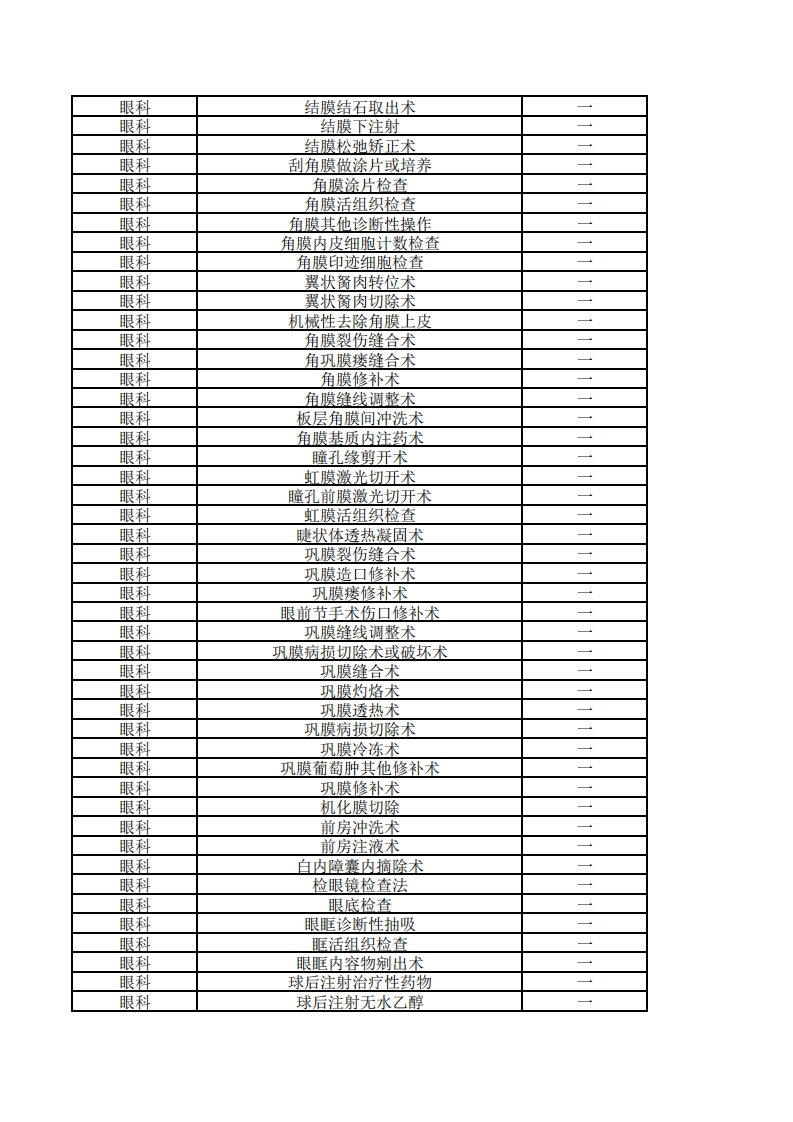 眼科手术分级管理目录科室名称手术操作名称手术级别眼科睑缘切开术眼科眼脸切开探查术一眼科眼睑切开引流术眼科眼睑切开异物取出术一眼科眼睑活组织检查眼科眼睑瘢痕切除术眼科眼睑病损切除术眼科脸板腺囊肿切除术一眼科睑板腺脓肿切开引流术一眼科眼脸小病损切除术一眼科脸板腺病损切除术眼科睑内翻缝合修补术眼科睑内翻矫正术眼科眦切开术眼科脸裂增大术眼科睑缘缝合术眼科脸板缝合术眼科眼睑裂伤缝合术眼科眉裂伤缝合术眼科眼睑拔睫毛术一眼科眼睑缝线去除眼科眼脸穿刺抽液术眼科泪腺活组织检查眼科泪点扩张术眼科泪小管探通术眼科鼻泪管探通术眼科人工泪管取出术眼科泪道植入物修正术眼科泪管植入物置换术眼科泪道植入物去除术眼科泪道挂线术眼科泪点切开术一眼科泪小管切开术眼科泪囊病损切除术眼科泪点封闭术眼科结膜切开异物取出术眼科结膜切开探查术眼科结膜引流术眼科结膜放射状切开术眼科结膜活组织检查眼科结膜囊探查术一眼科结膜刮片检查术眼科结膜病损或结膜组织的切除术眼科结膜病损切除术眼科结膜冷冻术一