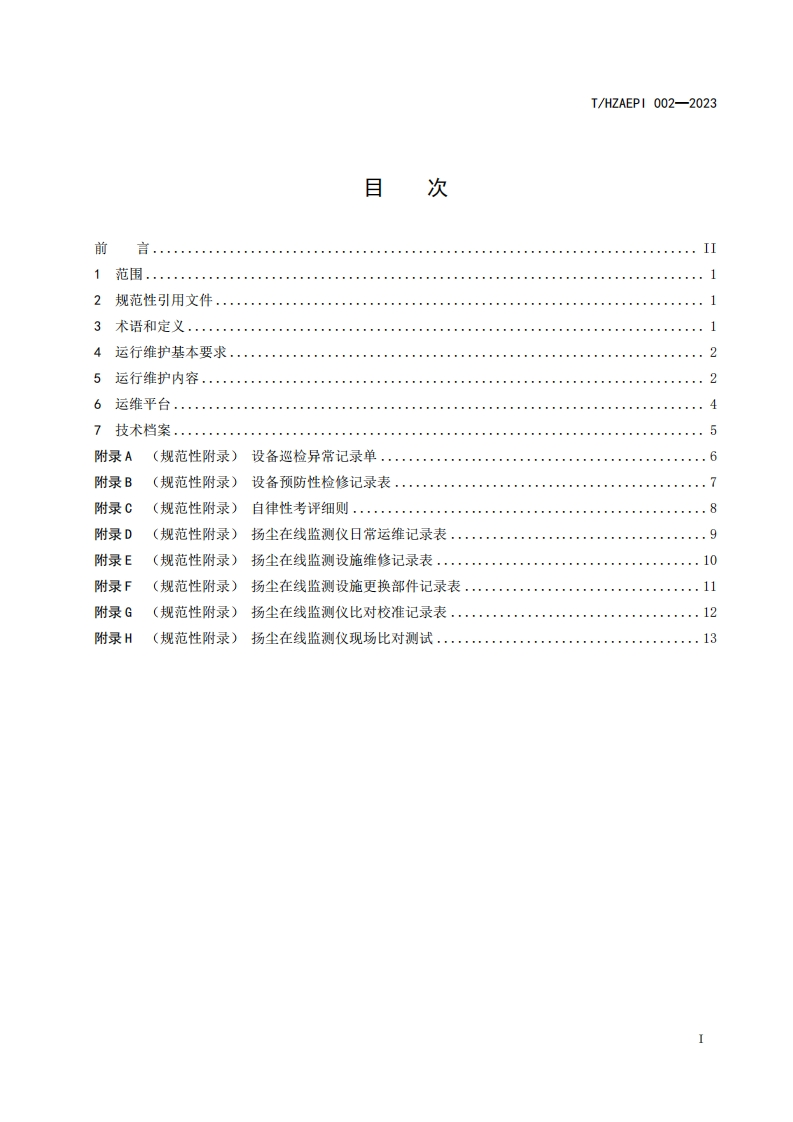 ICSCCS点击此处添加中国标准文献分团体标准T/HZAEPI 002-2023扬尘在线监测系统(光散射法)运行维护技术规范Dust on-line monitoring equipment (light scattering method)operational maintenancetechnology specification(征求意见稿)2023-X-XX发布XXXX-XX-XX实施杭州市环保产业协会发布