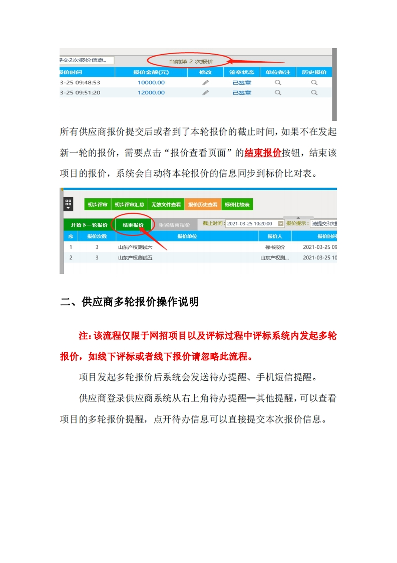一、采购代理多轮报价流程操作说明1、采购代理/评委组长由“报价历史查看”菜单发起多轮报价流程,填写截止时间,报价提示信息之后点击开启下一轮报价按钮,发起新一轮的报价。注:截止时间:本轮报价的报价结束时间。报价提示:本轮报价的报价提醒内容。项目开标开始下轮报价回的鸿示:前第1次极评标准备摩探粉微数多的单能的人间餐会躁多章质酸备往历酚初步评审1山峡产表五标书报价2021-03-25094位5310080.0已章QQ自6古量胜分折2标报价2021-03-250除51201200020Q白初开汇息围n看空程下-电最时同221-0站2511300。性示清视交2次服m镇息,的人山产权磁五行书程损2021-032509453100000已药摩山产权时大2021-03-3005120120000开的下一轮报价结束报价面圆结束服价酸止时问2021-03-251020:00可黎价牌示:请壁安3次餐价信息.当第服价人价时问报价金德(元山东产权测似五标书报价2021-03-2509485310000.00山东产根测试大提醒开启下一轮报价成功确定☐开启之后页面报价查看页面显示当前报价轮次。