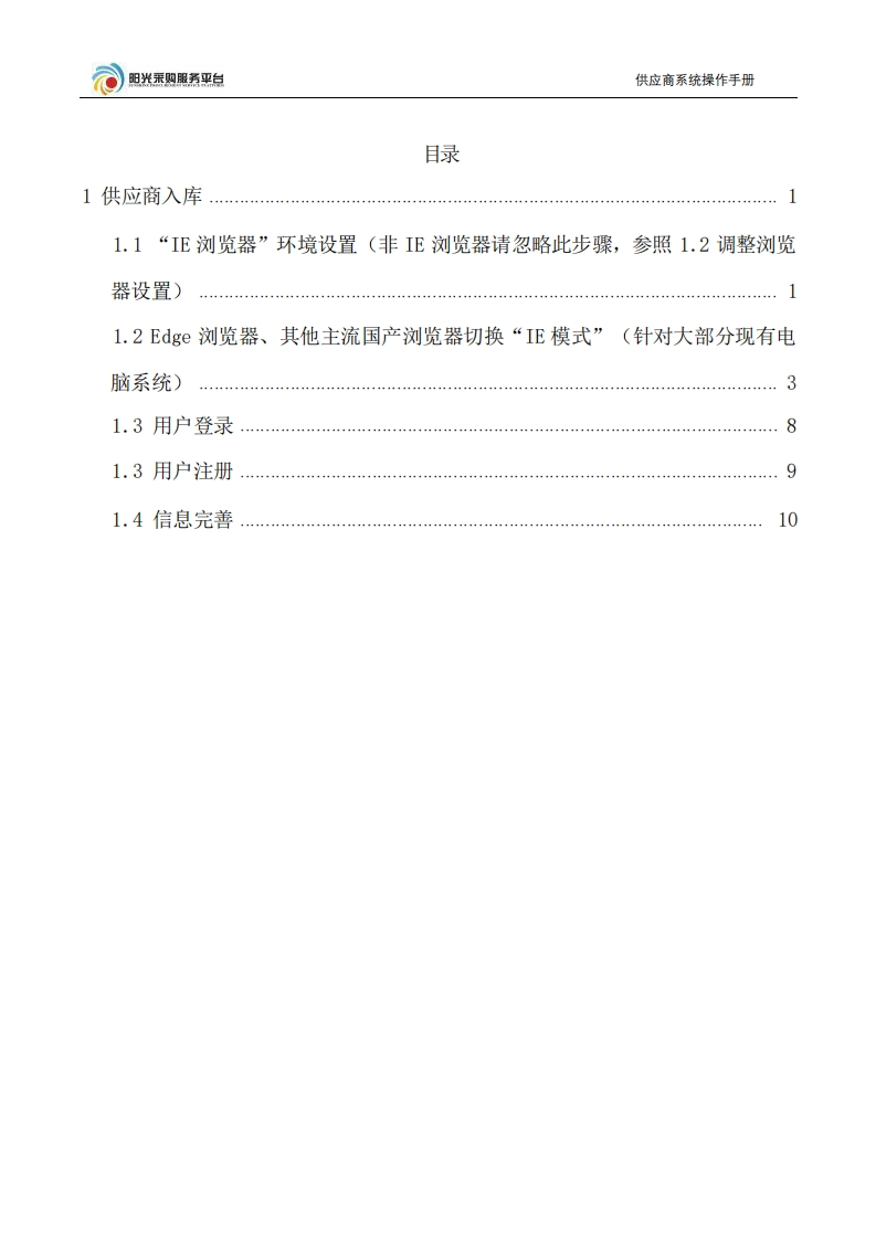 阳光采购服务平台—供应商注册操作手册V1.0(1)348072@abc6个月前发布关注私信0.76MB14页046阳光采购服务平台—供应商注册操作手册V1.0(1)此内容为付费资源,请付费后查看¥12¥22黄金会员免费钻石会员免费立即购买您当前未登录!建议登陆后购买,可保存购买订单付费资源 第1页 / 共14页 第2页 / 共14页 试读已结束,还剩12页,您可下载完整版后进行离线阅读 THE END标准规范 文本预览 阳光采购服务平台供应商系统操作手册供应商注册操作手册<阳光采购服务平台>版本:<1.0>阳光采购服务平台2024年3月平台运营支持QQ群:798520560 查看更多 收起部分 喜欢就支持一下吧收藏
