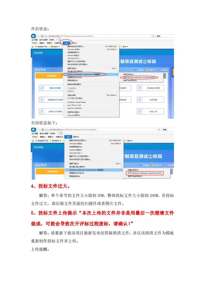 阳光采购服务平台系统使用常见问题1、系统建议使用浏览器是什么?阳光采购服务平台系统建议使用IE11浏览器。关于Internet ExplorerInternetExplorer 11版本:11.836.18362.0更新版本:11.0.190KB4556798产品1D:00150-20000-00003-AA459⊙2015 Microsot升Corporation(M)。保留所有权利。关闭g2、如何找到电脑的ie浏览器?解答:打开“此电脑”选项,之后打开C盘,按照以下路径找到ie浏览器。路径:C:Program Files(x86)Internet Explorer,出电脑,本地感由(C,Program Files(xi86),Internet Explorer名称修改日期类型大小☐en-Us2019-03-1919:41文件夹images2019-03-191252文件爽SIGNUP2019-03-191252文件夹☐zh-CN2019-03.1919:42文件夹▣ExtExport2019-03-191246应用程序44 KBhmmapi.dll2019-03-191246应用促序扩属49 KB☐ie9 props.propdesc2019-03-191246PROPDESC文件3 KBieinstal2019-03-191246应用程序470KBielowutil2019.03.191246应用程序217K8图IEShims.dn2020-02-1510:27应用程序扩展308KBiexplore2019-03-1919:42应用程序798KB图sqmapi.dl2019-03-191246应用程序扩展39K83、领取招标文件/答疑澄清文件被阻止?解答:IE浏览器打开工具菜单,将Windows Dfender SmartScreen筛选器关闭,只有重启IE浏览器后正常下载。