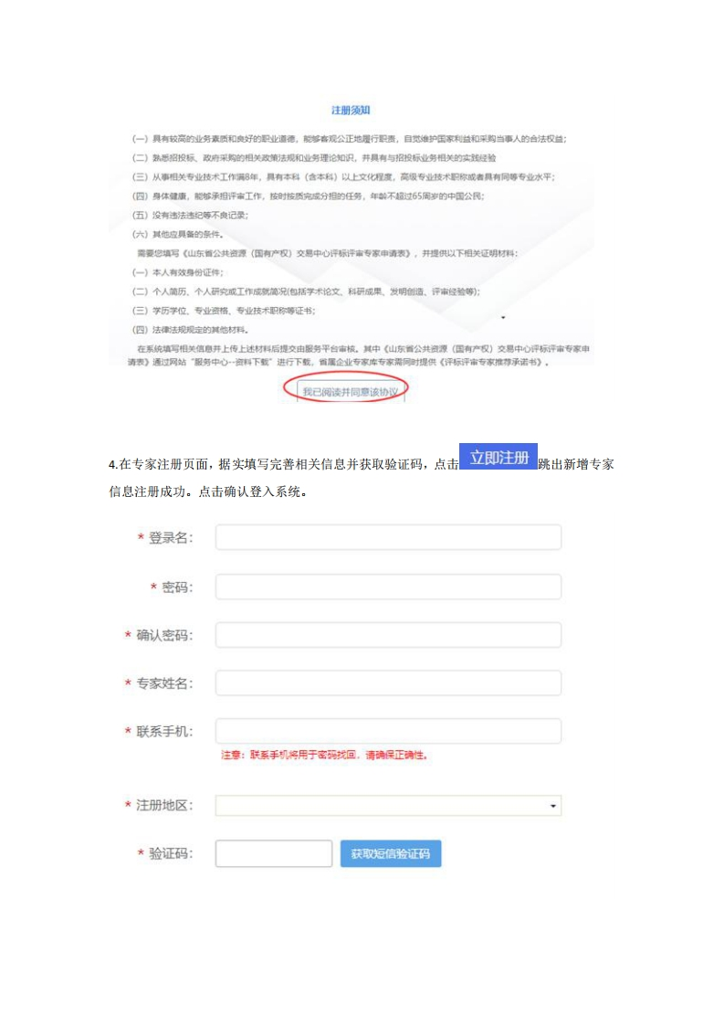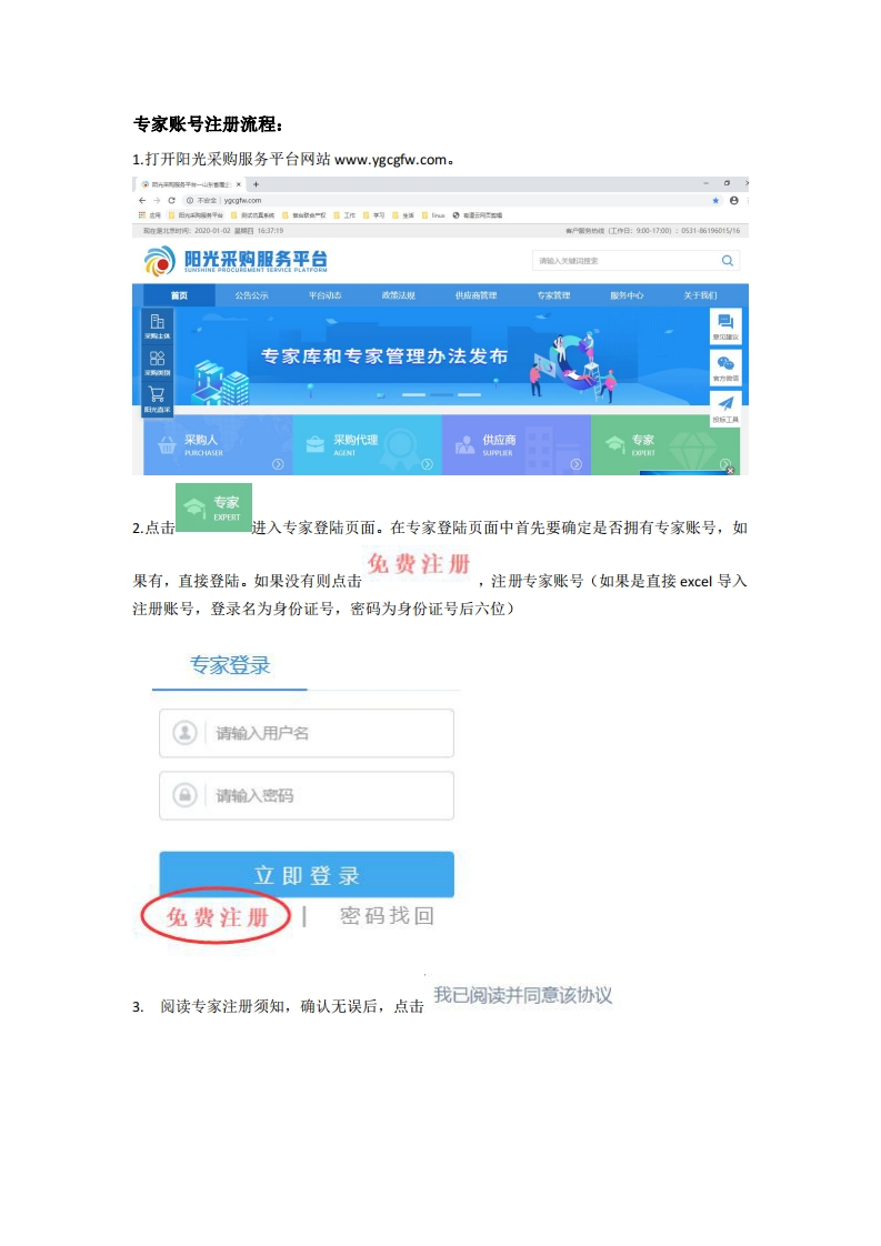 专家账号注册流程:1.打开阳光采购服务平台网站www.ygcgfw.com。←→C不ygt8m★日在是北时间:202001-02量辆阳1637:19客-黑务地塘工作日:900-1700:0531B5195015/16阳光采购服务平怠请输人关键词语室Q首页公告公示平台动志供商管理专家管理务中心关于我们路专家库和专家管理办法发布只标工具采购人采购代理税OSmALENT专家2.点击进入专家登陆页面。在专家登陆页面中首先要确定是否拥有专家账号,如免费注册果有,直接登陆。如果没有则点击,注册专家账号(如果是直接excel导入注册账号,登录名为身份证号,密码为身份证号后六位)专家登录请输入用户名请输入密码立即登录免费注册密码找回3.阅读专家注册须知,确认无误后,点击我已阅读并同意该协议