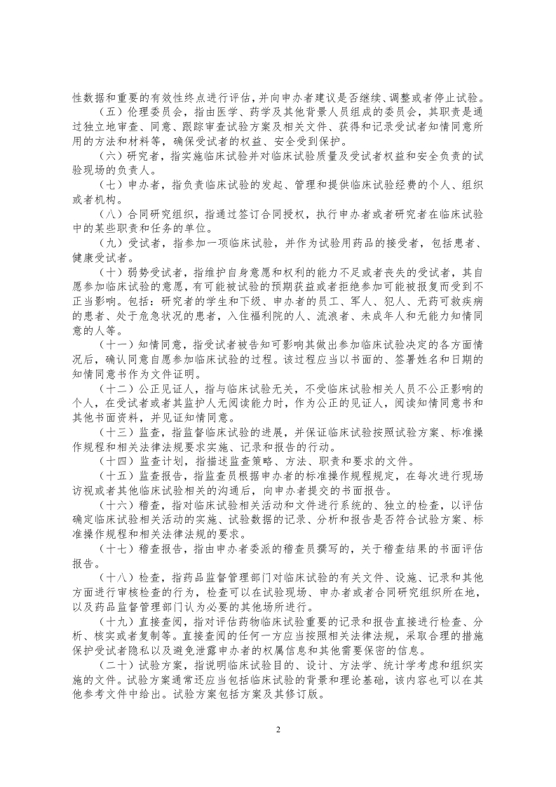 药物临床试验质量管理规范(2020年)第一章总则第一条为保证药物临床试验过程规范,数据和结果的科学、真实、可靠,保护受试者的权益和安全,根据《中华人民共和国药品管理法》《中华人民共和国疫苗管理法》《中华人民共和国药品管理法实施条例》,制定本规范。本规范适用于为申请药品注册而进行的药物临床试验。药物临床试验的相关活动应当遵守本规范。第二条药物临床试验质量管理规范是药物临床试验全过程的质量标准,包括方案设计、组织实施、监查、稽查、记录、分析、总结和报告。第三条药物临床试验应当符合《世界医学大会赫尔辛基宣言》原则及相关伦理要求,受试者的权益和安全是考虑的首要因素,优先于对科学和社会的获益。伦理审查与知情同意是保障受试者权益的重要措施。第四条药物临床试验应当有充分的科学依据。临床试验应当权衡受试者和社会的预期风险和获益,只有当预期的获益大于风险时,方可实施或者继续临床试验。第五条试验方案应当清晰、详细、可操作。试验方案在获得伦理委员会同意后方可执行。第六条研究者在临床试验过程中应当遵守试验方案,凡涉及医学判断或临床决策应当由临床医生做出。参加临床试验实施的研究人员,应当具有能够承担临床试验工作相应的教育、培训和经验。第七条所有临床试验的纸质或电子资料应当被妥善地记录、处理和保存,能够准确地报告、解释和确认。应当保护受试者的隐私和其相关信息的保密性。第八条试验药物的制备应当符合临床试验用药品生产质量管理相关要求。试验药物的使用应当符合试验方案。第九条临床试验的质量管理体系应当覆盖临床试验的全过程,重点是受试者保护、试验结果可靠,以及遵守相关法律法规。第十条临床试验的实施应当遵守利益冲突回避原则。第二章术语及其定义第十一条本规范下列用语的含义是:(一)临床试验,指以人体(患者或健康受试者)为对象的试验,意在发现或验证某种试验药物的临床医学、药理学以及其他药效学作用、不良反应,或者试验药物的吸收、分布、代谢和排泄,以确定药物的疗效与安全性的系统性试验。(二)临床试验的依从性,指临床试验参与各方遵守与临床试验有关要求、本规范和相关法律法规。(三)非临床研究,指不在人体上进行的生物医学研究。(四)独立的数据监查委员会(数据和安全监查委员会,监查委员会,数据监查委员会),指由申办者设立的独立的数据监查委员会,定期对临床试验的进展、安全