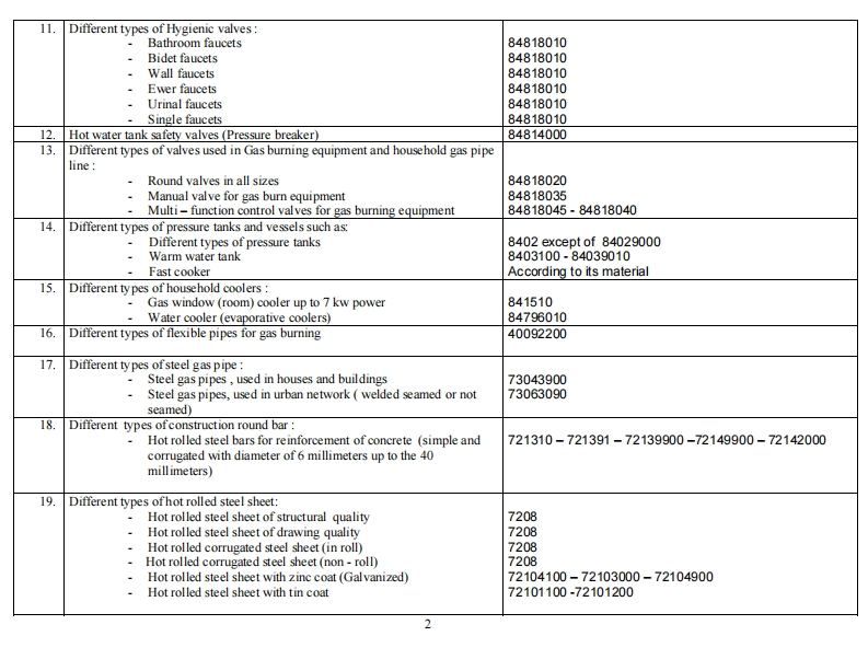 List of Products under Compulsory Standards Regulations-ImportInspection of Goods and Import and Ex port Affairs DepartmentSeptember 2005Mechanic and metallurgyNo.GoodsTariff No.Portable fire extinguisher842410002.Different types of water heaterGas water heater84191100Oil water heater8419190003.Different types of gas stovesGas stoves with oven73211110Gas stoves without oven73211120-73211190Gas stoves with oven and fryer for restaurants73211110Pressure gas stoves732112004.Different types of gas and kerosene heaterOil heater (with wick or heat tube)73218100Gas heater with heat tube or without heat tube)732182005.Different type of iron beam (I,H):Hot rolled I-Beams-Medium flange I-beams72163200Hot rolled I-Beams-Narrow Flange I-Beams I Range72163200Hot rolled wide ranker iron beam72163300Light parallel wide flange hot rolled iron beam72163300Heavy parallel wide flange hot rolled iron beam72163300Normal parallel wide flange hot rolled iron beam721633006.Gas burn lighting lamp940550207.Different types of regulator for liquid gas cylinder:Screwtype84811010Pin or pressure type84811010High pressure and adjustable type848110108.Fluid Gas Cylinder7311009.Different types of medical and industrial cylinders73110010.Gas cylinders valves and inlet and outlet joints and connections848180301