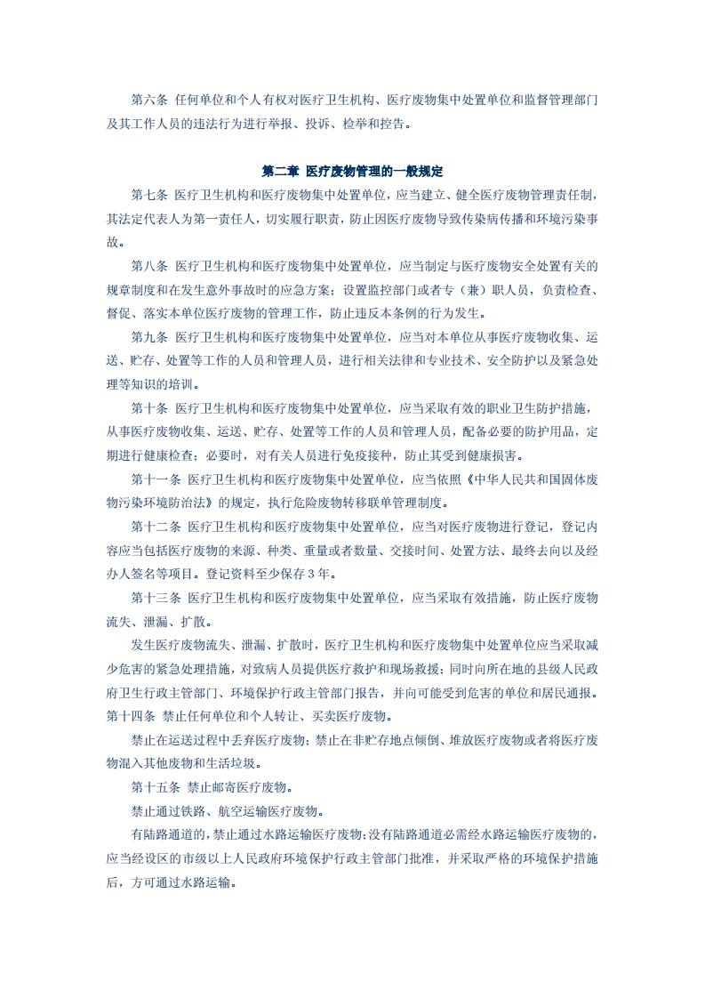 医疗废物管理条例中华人民共和国国务院令第380号《医疗废物管理条例》已经2003年6月4日国务院第十次常务会议通过,现予公布,自公布之日起施行。总理温家宝二00三年六月十六日第一章总则第一条为了加强医疗废物的安全管理,防止疾病传播,保护环境,保障人体健康,根据《中华人民共和国传染病防治法》和《中华人民共和国固体废物污染环境防治法》,制定本条例。第二条本条例所称医疗废物,是指医疗卫生机构在医疗、预防、保健以及其他相关活动中产生的具有直接或者间接感染性、毒性以及其他危害性的废物。医疗废物分类目录,由国务院卫生行政主管部门和环境保护行政主管部门共同制定、公布。第三条本条例适用于医疗废物的收集、运送、贮存、处置以及监督管理等活动。医疗卫生机构收治的传染病病人或者疑似传染病病人产生的生活垃圾,按照医疗废物进行管理和处置。医疗卫生机构废弃的麻醉、精神、放射性、毒性等药品及其相关的废物的管理,依照有关法律、行政法规和国家有关规定、标准执行。第四条国家推行医疗废物集中无害化处置,鼓励有关医疗废物安全处置技术的研究与开发。县级以上地方人民政府负责组织建设医疗废物集中处置设施。国家对边远贫困地区建设医疗废物集中处置设施给予适当的支持。第五条县级以上各级人民政府卫生行政主管部门,对医疗废物收集、运送、贮存、处置活动中的疾病防治工作实施统一监督管理:环境保护行政主管部门,对医疗废物收集、运送、贮存、处置活动中的环境污染防治工作实施统一监督管理。县级以上各级人民政府其他有关部门在各自的职责范围内负责与医疗废物处置有关的监督管理工作。