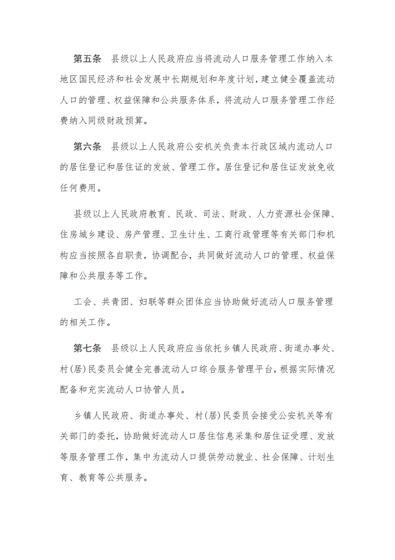 山东省流动人口服务管理暂行办法(2016年11月30日山东省人民政府令第306号发布自2017年1月1日起施行)第一章总则第一条为了保障流动人口合法权益,加强和创新流动人口服务管理,维护社会秩序,促进经济社会协调发展,根据国务院《居住证暂行条例》和有关法律、法规,结合本省实际,制定本办法。第二条本省行政区域内流动人口的居住管理、权益保障和公共服务,适用本办法。外国人、无国籍人和香港、澳门特别行政区居民、台湾地区居民的居住登记,按照国家有关规定执行。第三条本办法所称流动人口,是指离开常住户口所在地跨县(市、区)居住3日以上的人员。设区的市人民政府可以结合本地实际情况,具体确定纳入服务管理的流动人口范围。第四条流动人口服务管理遵循公平对待、便捷服务、合理引导、规范管理的原则。