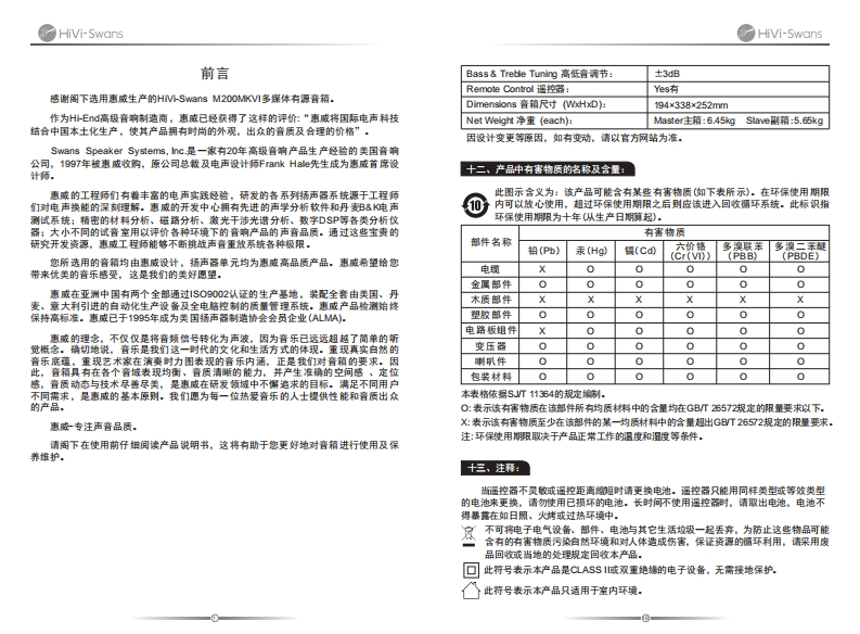 ▣防扫码关注惠威集团公众号HiVi-Swans M200MKVI多媒体有源音箱注册产品即享保修产品说明书设t计Designc Hi-Swans制造商Mu少c,©C珠海惠蓝料技有限公同地址≤:珠海市联港工业区东成路南1号电话TRk400-020919www.hivi.com因设计变更等原因,所示资料可能与实物不符,想不另行通知。Due to the reasons in the change of design or others.product information contained here may not ben conformity with product itselt.We reserve the rig城d no pror no发e before中ange