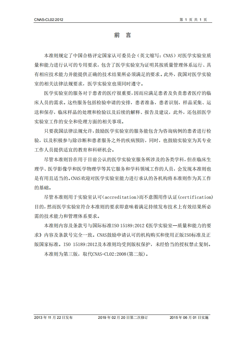 医学实验室质量和能力认可准则348072@abc4个月前发布关注私信0.13MB2页027医学实验室质量和能力认可准则此内容为付费资源,请付费后查看¥12¥22黄金会员免费钻石会员免费立即购买您当前未登录!建议登陆后购买,可保存购买订单付费资源 第1页 / 共2页 第2页 / 共2页 已完成全部阅读,共2页 THE END标准规范 文本预览 CNASCNAS-CL02医学实验室质量和能力认可准则Accreditation Criteria for the Quality andCompetence of Medical Laboratories中国合格评定国家认可委员会2013年11月22日发布2019年02月20日第二次修订2015年06月01日实施 查看更多 收起部分 喜欢就支持一下吧收藏