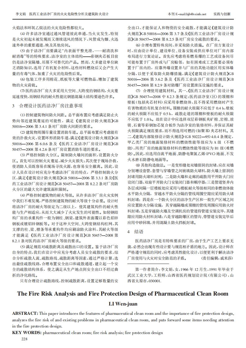 科技情报开发与经济SCI-TECH INFORMATION DEVELOPMENT ECONOMY2010年第20卷第2期文章编号:1005-6033(2010①02-0227-02收稿日期:2009-12-03医药工业洁净厂房的火灾危险性分析及建筑防火设计李文娟(山西省医药规划设计院(有限公司),山西太原,030001D摘要:介绍了医药工业洁净厂房的特点和防火设计的重要性,分析了其火灾危险性及存在的问题,提出了在消防设计上应注意的相关事项。关键词:医药工业洁净厂房:火灾危险性分析:防火设计中图分类号:文献标识码:A性极好,发生火灾后,烟量特别大,造成热量无处散发,甚至会使1医药工业洁净厂房防火设计的重要性轰燃提前发生,大大缩短洁净室各部位材料达到燃点的时间,不(D以人为本的设计要求。“以人为本”就是要在设计中将保利疏散和扑救。护人的生命作为首要的设计任务。人是生产车间的主要生产指()进医药洁净厂房必须经过换鞋、更衣、洗手、更换洁净工挥者和操作者,因此要把人的生命安全放在设计第一位。作服、手消毒、气闸室等隔离间,平面布置复杂,分割多,增加了疏(公洁净厂房特殊性。医药工业洁净厂房内有不少精密、贵散路线上的障碍,延长了安全疏散的距离和时间:且由于洁净无重的设备、仪器,建设投资昂贵,如发生火灾,损失极大。菌的要求,人员入口处的门不能向疏散方向开启,火灾时通过入口疏散极为复杂和困难。2医药工业洁净厂房的火灾危险性原因分析(3)医药工业洁净厂房经常使用各种易燃易爆化学危险物品,且其化学反应也有燃烧爆炸危险,如使用环氧乙烷、酒精、煤(D医药洁净厂房由于洁净无菌的工艺要求,空间密闭、密封气活性镍、钯炭等极易引起燃烧的物品,制剂工艺灭菌工序中的能源问题已经成为当今世界的严重挑战,建筑能耗占人类总个年龄层次人群的生活环境:小区板式高层底部有商业群房,为能耗的30%左右,建筑节能设计是项综合性的课题,建筑的体型居民提供了商业活动的地点。和外围护结构都影响到建筑的节能效果。御景园的设计采用外墙生态住宅又称“健康住宅”。生态住宅不只是绿化,而且从规自保温、低辐射中空玻璃、地板采暖等多项技术,以满足节能和热划上看,生态小区的总体布局、单体空间组合、房屋构造、自然能工的要求。为达到和超过0%的国家节能标准,我们的设计师在源的利用、节能措施、绿化系统以及生活服务配套的设计,都是设计过程中做了大量严格的计算,有效地提高了居室的舒适度。以改善及提高居民生态环境、生命质量为出发点和目标。御景园在具体设计上,注重绿化布局的层次、风格与建筑物要相互辉3生态与健康映:注重不同植物各方面的相互补充融合,除栽植普通草本植物生态小区既是一种小区规划新理念,更是未来城市追求的外,还栽植观赏花木、阔叶乔木、食用果树、芳香植物等,能对小远景目标和必然趋势。生态小区与绿色小区的概念相近似,但与区居民从视觉感官和心理上起到消除精神疲劳等的作用。传统小区相比有本质的不同,主要有以下特点:和谐性生态小区4结语内自然与人共生,人类回归自然,亲近自然,自然融于小区,小区融于自然:同时,能营造满足人类自身发展需求的环境,富有人在建筑师的精心设计下,安钢御景园住宅小区不仅有多样情味,充满浓厚的文化气息,拥有强有力的互帮互助的群体,呈化的户型供住户选择,更有高品质的外部环境,既满足了安钢人现出繁荣、生机和活力。我们御景园的建设虽然不是真正意义上的要求,同时也吸引了不少外来人士的关注,目前已成为安阳市的生态小区,但我们的设计师正在向这个目标努力。高新技术开发区的一个亮点。(贵任编辑:李敏)御景园为增强小区的归属感而建立标志性建筑“会所”、具有中心性的广场一景观大道,对居民形成有魅力的开散空间:第一作者简介:吕瑾,女,1979年3月生,2003年毕业于建立配套齐全、布局合理的生态基础设施一诊所、储蓄所、幼郑州中原工学院,助理工程师,安阳钢铁集团治金设计有限责任儿园,以及体育设施一篮球场、羽毛球场等,创造出便利于各公司土建科,河南省安阳市,455000.Establishing the Green Ecological Garden for Workers of Anyang Iron Steel Group Co.,Ltd-Design of Yujingyuan Residence Community of Anyang Iron Steel Group Co.,LtdLU.JinABSTRACT:Connecting with the design of Yujingyuan residence community of Anyang Iron Steel Group Co.,Ltd,thispaper considers the green ecological building from the aspects of environment and planning,the green and environmentalprotection,the economy and health.KEY WORDS:residence community:green ecological environment;Anyang Iron Steel Group Co.,Ltd227