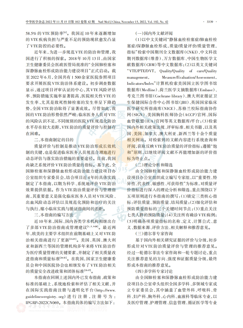 ·3338·中华医学杂志2022年11月15日第102卷第42期Natl Med J China,November15,2022,Val.102.No.42·标准与规范·医院内静脉血栓栓塞症防治质量评价与管理指南(2022版)全国肺栓塞和深静脉血栓形成防治能力建设项目专家委员会《医院内静脉血栓栓塞症防治质量评价与管理指南(2022版)》编写专家组通信作者:翟振国,中日友好医院呼吸中心呼吸与危重症医学科国家呼吸医学中心,北京100029,Email:haizhenguo2011@126.com;王辰,中国医学科学院北京协和医学院,北京100730,Email:cyh-Birm@263.com【摘要】静脉血栓栓塞症(VTE)是住院患者非预期死亡的重要原因,已构成医疗质量和患者安全的潜在风险。质量评价与管理是VT正防治中的重要环节,是推动VTE防治形成长效机制的关键,也是促进临床医务人员规范合理地进行动态评估与落实防治措施的重要途径。目前,我国尚缺乏系统评价VTE防治质量的指标。基于此,全国肺栓塞和深静脉血栓形成防治能力建设项目办公室组织专家委员会,在回顾国内外已发布指南、政策和标准的基础上,经过德尔菲专家咨询和多学科专家研讨,以“重要性、特异性、代表性、敏感性、可获得性”为标准,制定了评估质量、预防质量、结局质量三大类核心指标,明确了各项质量指标的名称、定义、计算公式、意义、数据来源、评价方法、相关解释和推荐意见,以期强化临床医务人员对VTE风险、出血风险动态评估以及规范化预防和治疗的关注与执行,缩小临床实践与循证指南间的差距。【关键词】静脉血栓栓塞;绩效指标:质量评价基金项目:中国医学科学院医学与健康科技创新工程项目(2020-2M-A-022):国家重点研发计划(2016YFC0905600):重大呼吸系统疾病全国性诊疗质控平台建设和规范化诊疗方案技术推广2022-NHLHCRF-LX-01-0108)第一部分概述要原因,已构成医疗质量和患者安全的潜在风险,成为临床医务人员和医院管理者面临的严峻静脉血栓栓塞症(venous thromboembolism,问题1。VTE)包括深静脉血栓形成(deep vein thrombosis,对2007至2016年我国90家医院的数据进行DVT)和肺血栓栓塞症(pulmonary分析发现,10年来我国VTE的住院率从3.2/10万thromboembolism,PTE),其中急性PyTE是肺栓塞最人上升到17.5/10万人;同时,DissolVE-2研究表明,常见的临床类型,一旦发生有致死可能。近20年我国的外科住院患者VTE中、高风险比例分别为的循证医学证据表明,通过实施规范合理的预防措32.7%和53.4%,内科患者VTE高风险比例为施,可以有效降低医院相关性VTE事件的发生2。36.6%,而采取了合理预防措施的比例在外科仅为一、我国VTE防治现状9.3%,内科为6.0%);这一结果远低于2008年医院相关性VTE是住院患者非预期死亡的重END0RSE研究在全球多中心调研报告的39.5%~D01:10.3760/cma.j.cm112137-20220623-01373收稿日期2022-06-23本文编辑吕相征引用本文:全国肺栓塞和深静脉血栓形成防治能力建设项目专家委员会,《医院内静脉血栓栓塞症防治质量评价与管理指南(2022版)》编写专家组.医院内静脉血栓栓塞症防治质量评价与管理指南■(2022版)0].中华医学杂志,2022,102(42:3338-3348.D0L10.3760/cmaj.cm112137-20220623-01373.