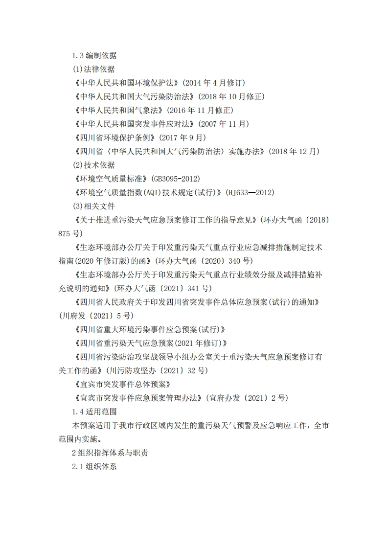 宜宾重污染天气应急预案(2021年修订)1总则为建立健全重污染天气应急响应机制,及时有效应对重污染天气,最大限度降低重污染天气造成的危害,保障人民群众身体健康,结合我市实际,按照《四川省污染防治攻坚战领导小组办公室关于重污染天气应急预案修订有关工作的函》(川污防攻坚办〔2021)32号)及《四川省重污染天气应急预案(2021年修订)》相关规定,制定我市重污染天气应急预案(2021年修订)(以下简称《预案》)。1.1指导思想以习近平生态文明思想和党的十九大精神为指导,协同推动经济高质量发展与生态环境高水平保护,把生态文明建设融入政治建设、经济建设、文化建设和社会建设各方面和全过程,形成节约资源、保护环境的空间格局、产业结构、生产方式和生活方式。1.2工作原则1.2.1重污染天气应急工作原则以人为本,预防为主。把保障人民群众身体健康作为重污染天气应对工作的出发点,坚持平战结合,强化节能减排措施,有效预防重污染天气的形成,减轻重污染天气造成的危害程度。科学预警,及时响应。建立健全重污染天气的监测、预警、响应体系,准确把握空气质量和气象条件的变化情况,提前发布预警信息,为应急响应预留缓冲时间,及时有效应对重污染天气。属地管理,部门联动。重污染天气应急工作在市委市政府的统一领导下,统一指挥、分级负责,各级各部门协调联动,建立健全信息共享机制,统一行动,联防联控。信息公开,社会参与。完善信息公开制度,主动公布重污染天气预警及应对信息,加强宣传引导,提高公众自我防护意识及参与意识。明确责任,强化落实。明确各级政府、各有关部门职责分工,厘清工作重点、工作程序,严格落实工作职责,确保监测、预警、响应等应急工作各环节有人、有据、有序、有效执行。1.2.2区域重污染天气应急联动工作原则始终坚持区域重污染天气应急联动,责任共担、信息共享、联防联治、群策群力,协同应对重污染天气,推进区域大气环境质量持续改善。