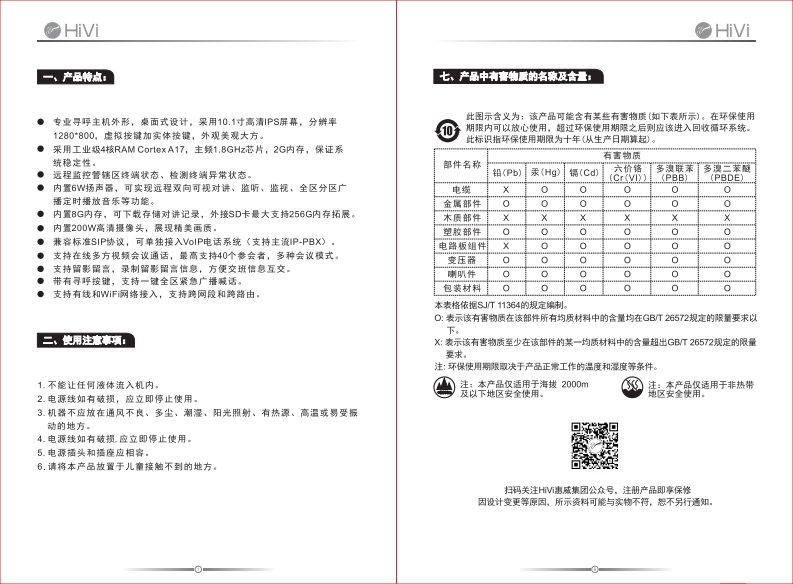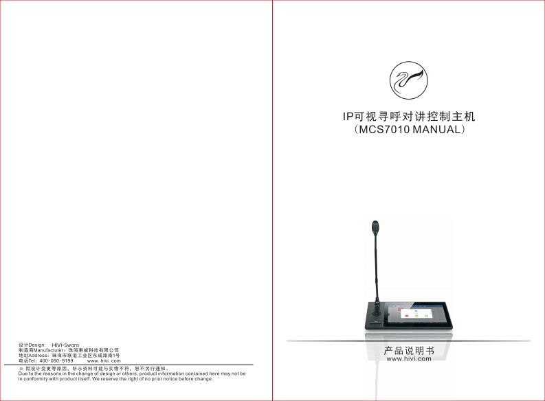 IP可视寻呼对讲控制主机(MCS7010 MANUAL)i设计Des3n:H/-Swa6商Maulr:海惠酸科技有限公司地tAddress:殊海市联港工业区东成痛南1号产品说明书电话Te:400-090-9199wwm.hivi comwww.hivi.com因没计变更等源因。所示簧料可能与实物不符,想不另行通如。Due to the reasons in the change of design or others.preduet information contained here may not bein conformity with product itself.We reserve the right of no prior notice before change.