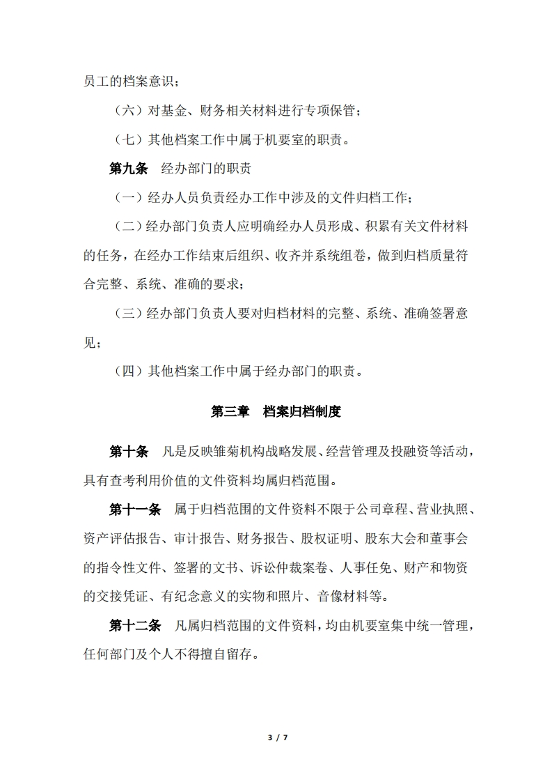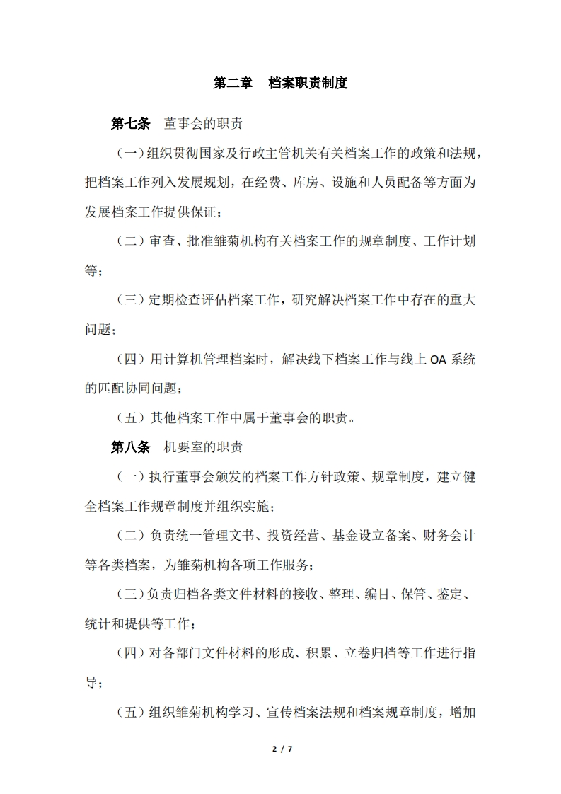 米雏菊1机构《档案管理办法》第一章总则第一条根据《中华人民共和国档案法》、《企业档案管理办法》和国家档案管理工作的标准,加强雏菊机构各类档案的收集、整理、和管理工作,有效保护和利用档案,使其更好地为雏菊机构的管理、经营等各项工作服务,特制定本办法。第二条雏菊机构的档案是指在经营、管理等各项工作中直接形成的对国家、社会和雏菊机构具有保存价值的各种文本、图表、音像等不同形式和载体的历史记录,是雏菊机构的知识产权凭证。第三条雏菊机构各种门类、载体的档案实行集中统一管理的原则。第四条雏菊机构档案工作由行政管理部分管,设立机要室,负责对档案工作实行统筹规划、组织协调、建立健全规章制度,在档案工作中进行监督和指导。第五条各部门应将文件材料的形成、积累、整理和归档工作纳入日常工作计划,实行岗位职责制。第六条没有办理归档手续或归档文件不完整、不准确的部门或项目不予申报绩效考核。1/7