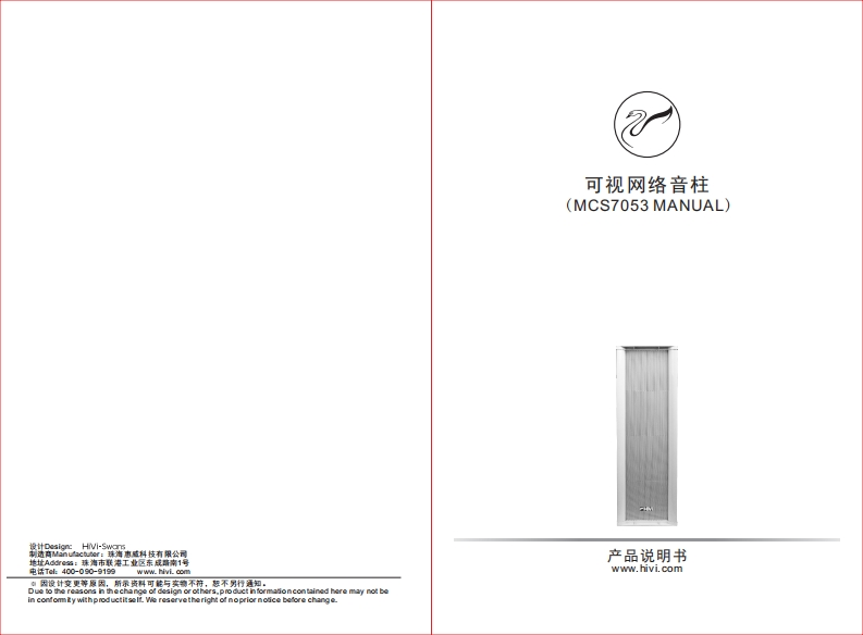 可视网络音柱(MCS7053 MANUAL)地址A业e运:珠海市联港工业区东成路离1号产品说明书电话Tel400-0g0-9199www.hivi.comwww.hivi.com南因设计变更等原因,所示资料可能与宾物不符,怎不另行通知。Due to the reasons in thechange of design or others.product in formationcontained here may not bein confomty withproductitselt We reservetheright of noprior notice before change.